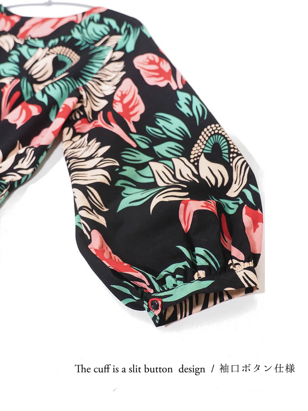 かっこよく上品に着こなせるツナギを、比翼仕立てでボタンが外から見えないスッキリデザインで、さらにカッコよく。ウェストはゴムで着心地よく、腰リボンでさらにサイズ調整可能。パンツは裾に向かって緩やかに細身のデザインで大人っぽく。程よい膨らみのバルーン袖はボタン付き。両サイドポケット付。
