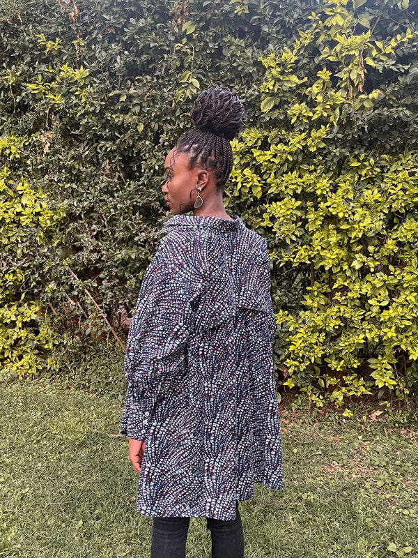細部までこだわったデザインが光るトップス。フロントは比翼仕立てでボタンを見せず、すっきりとした印象に仕上げています。
