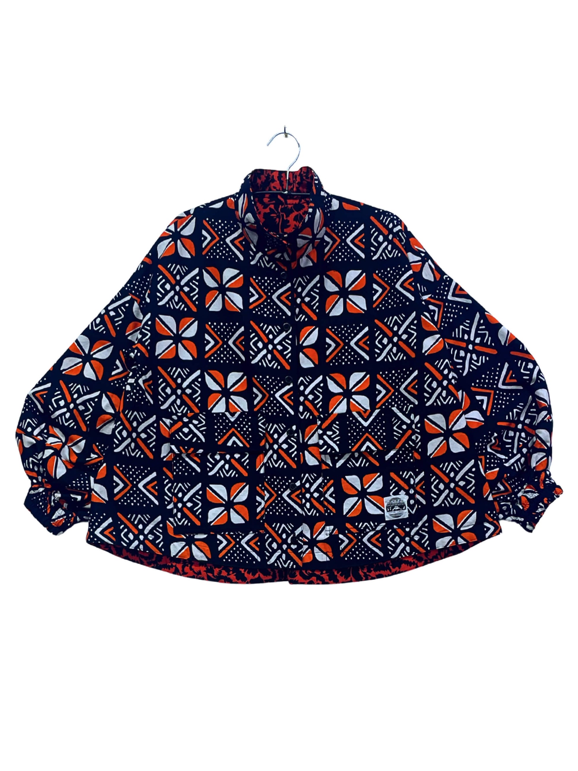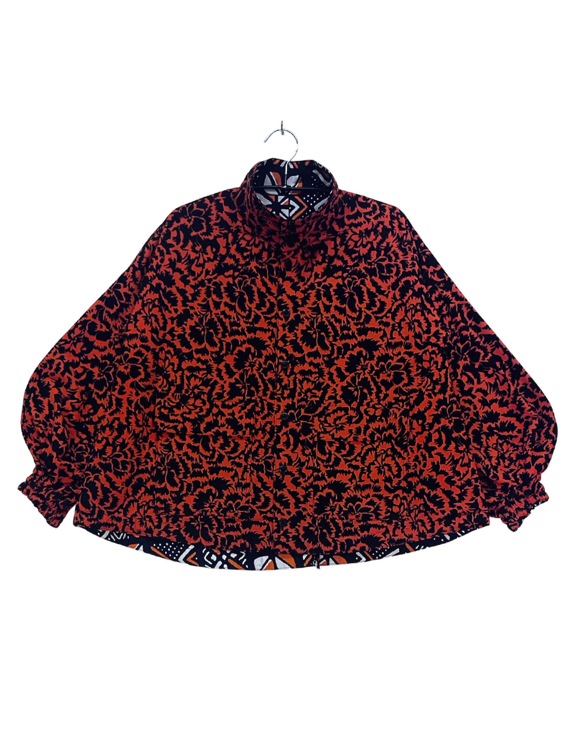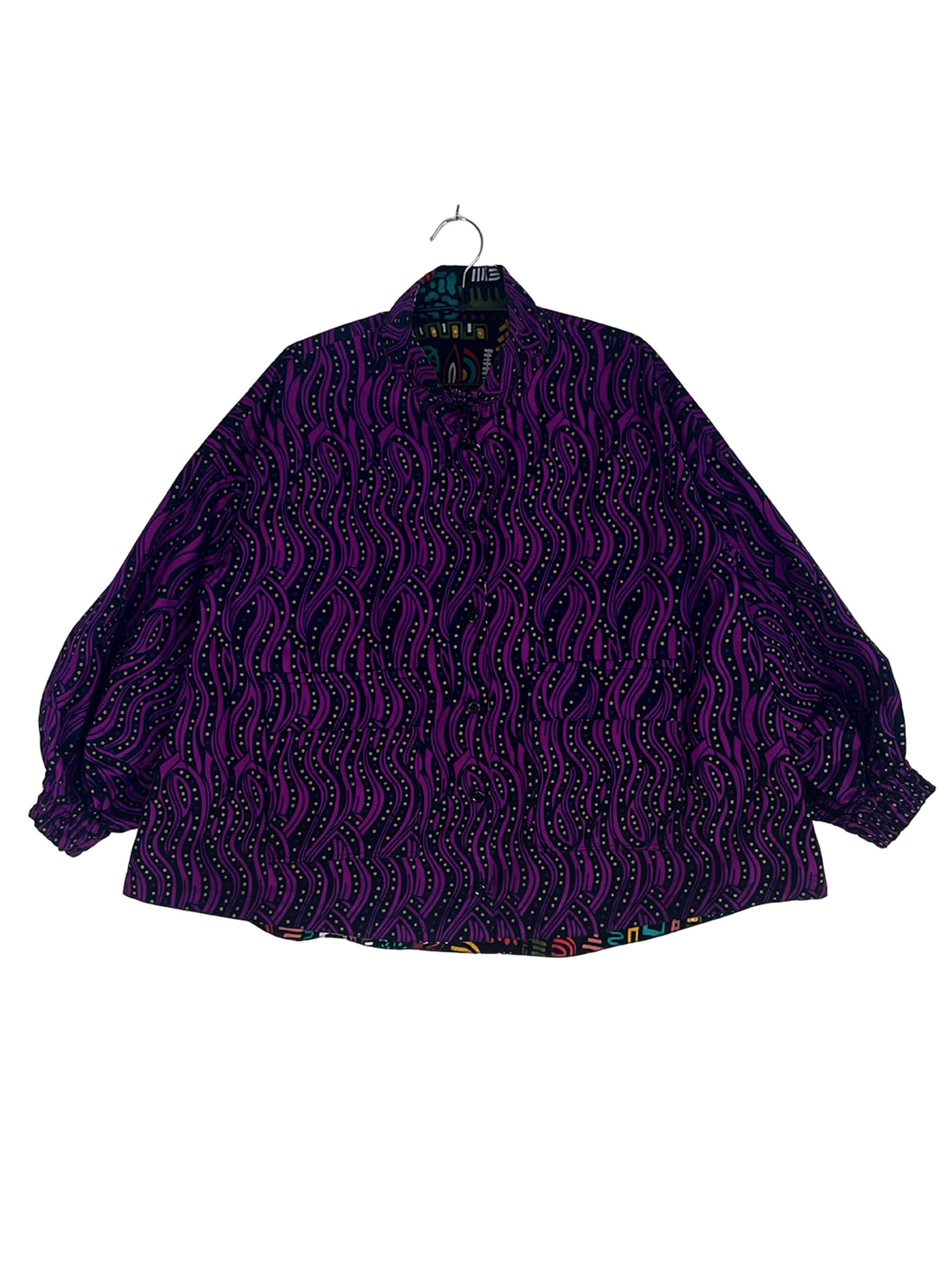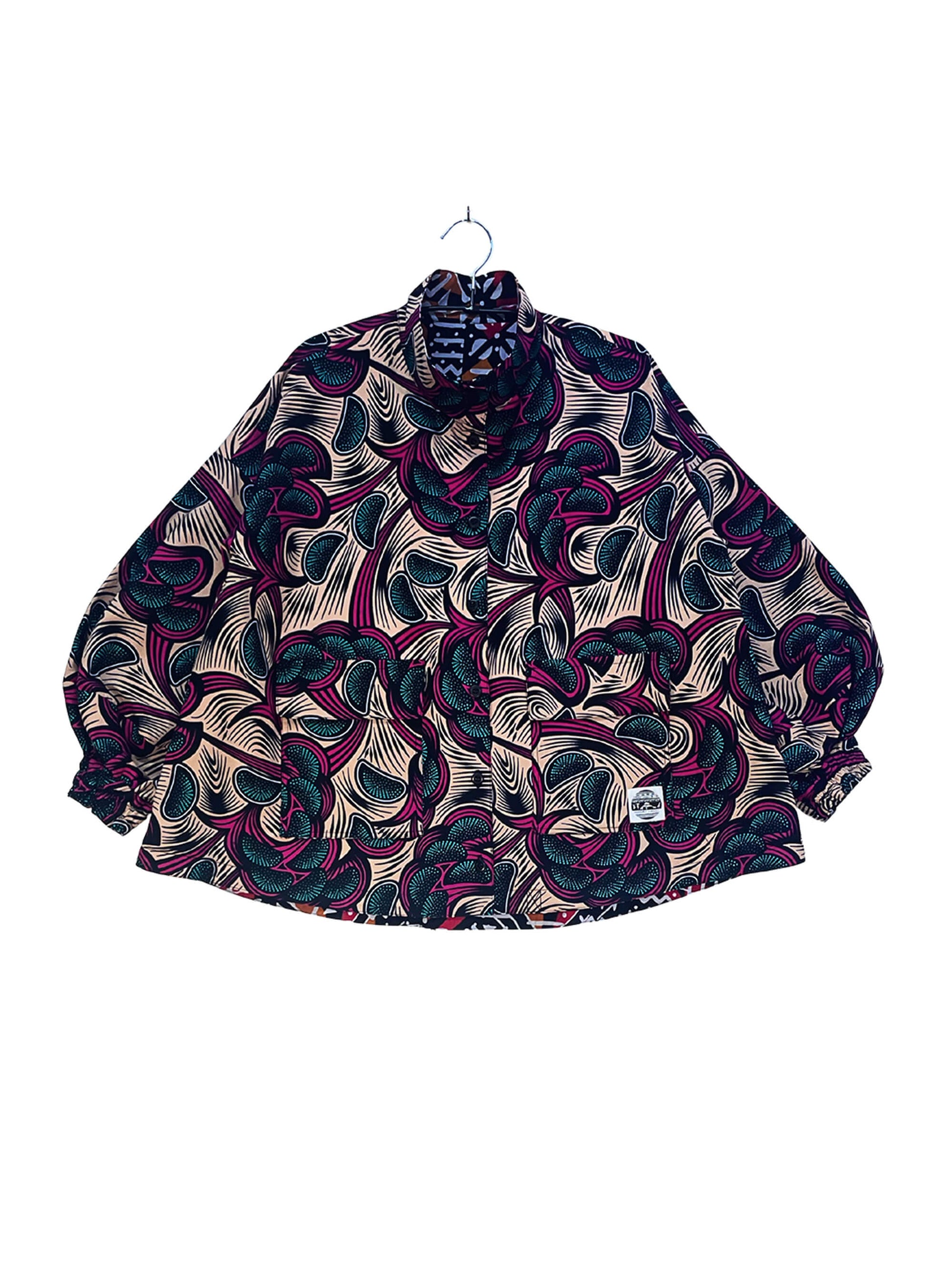 2色のキテンゲを使用し、リバーシブルで着こなしの表情を変えられるブルゾンジャケット。クラシカルなハイネックとボリュームスリーブのバランスが絶妙で、羽織るだけでスタイリングの主役になります。襟はそのまま立ててエレガントに、折り返して裏地を見せてシャツカラー風にすることも可能です