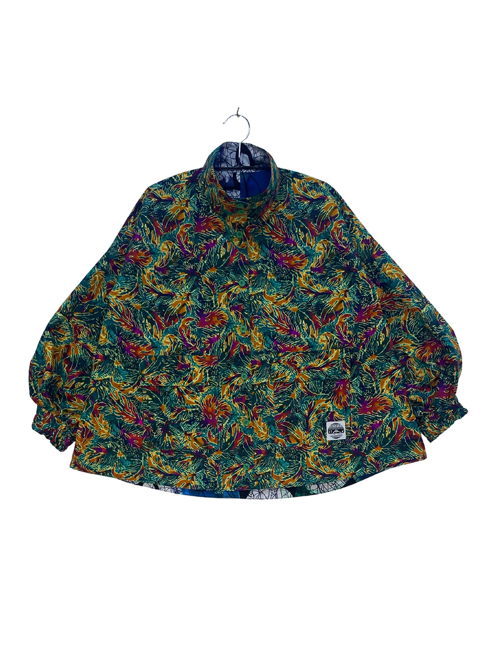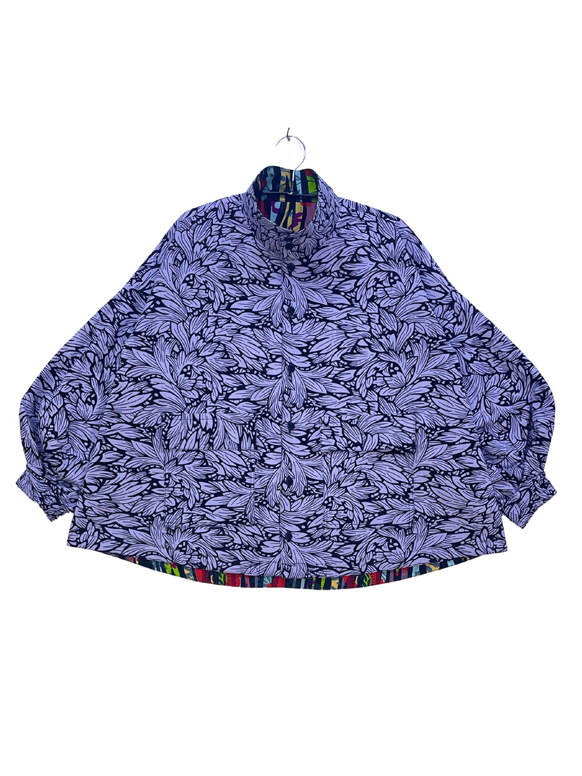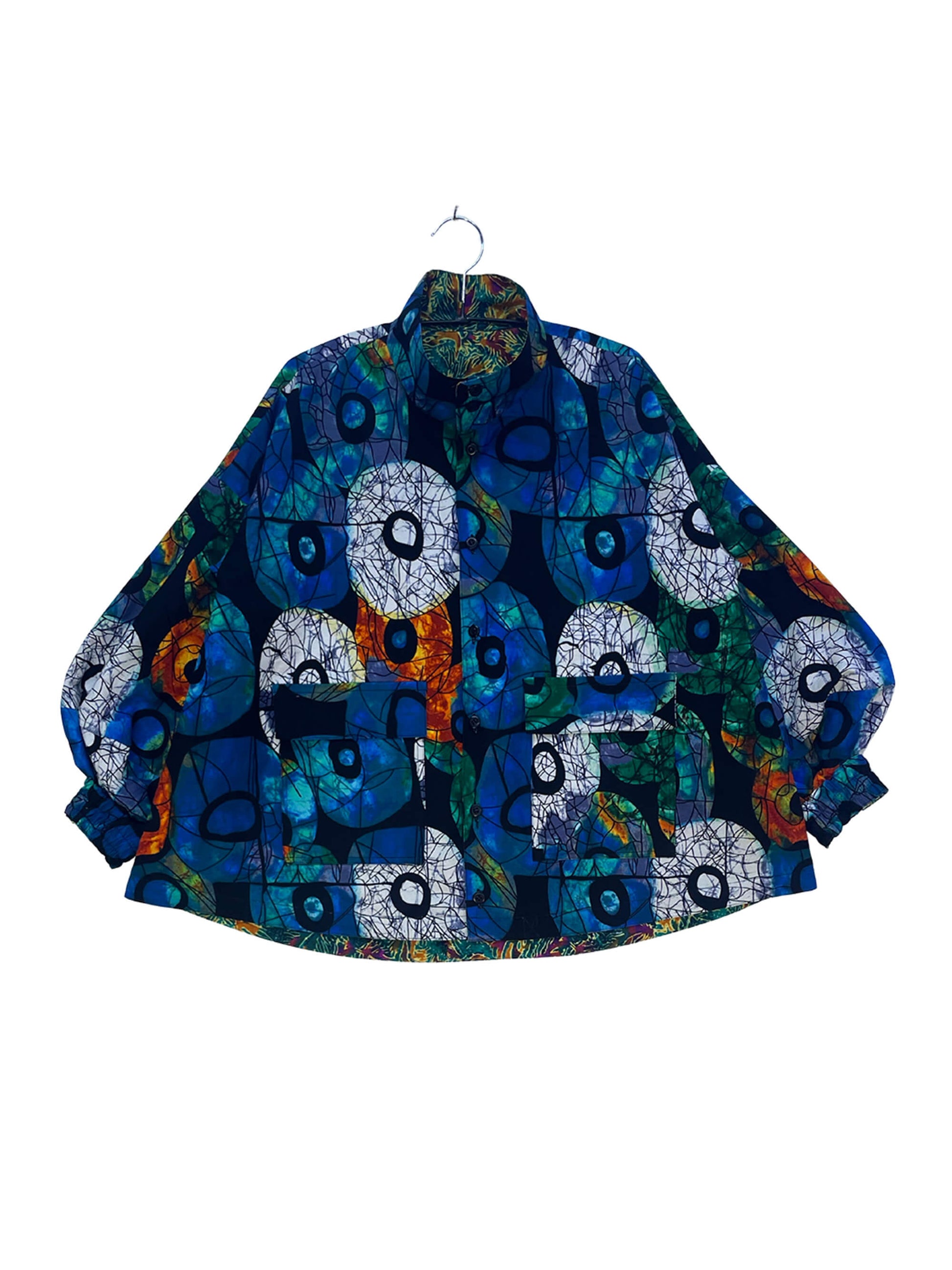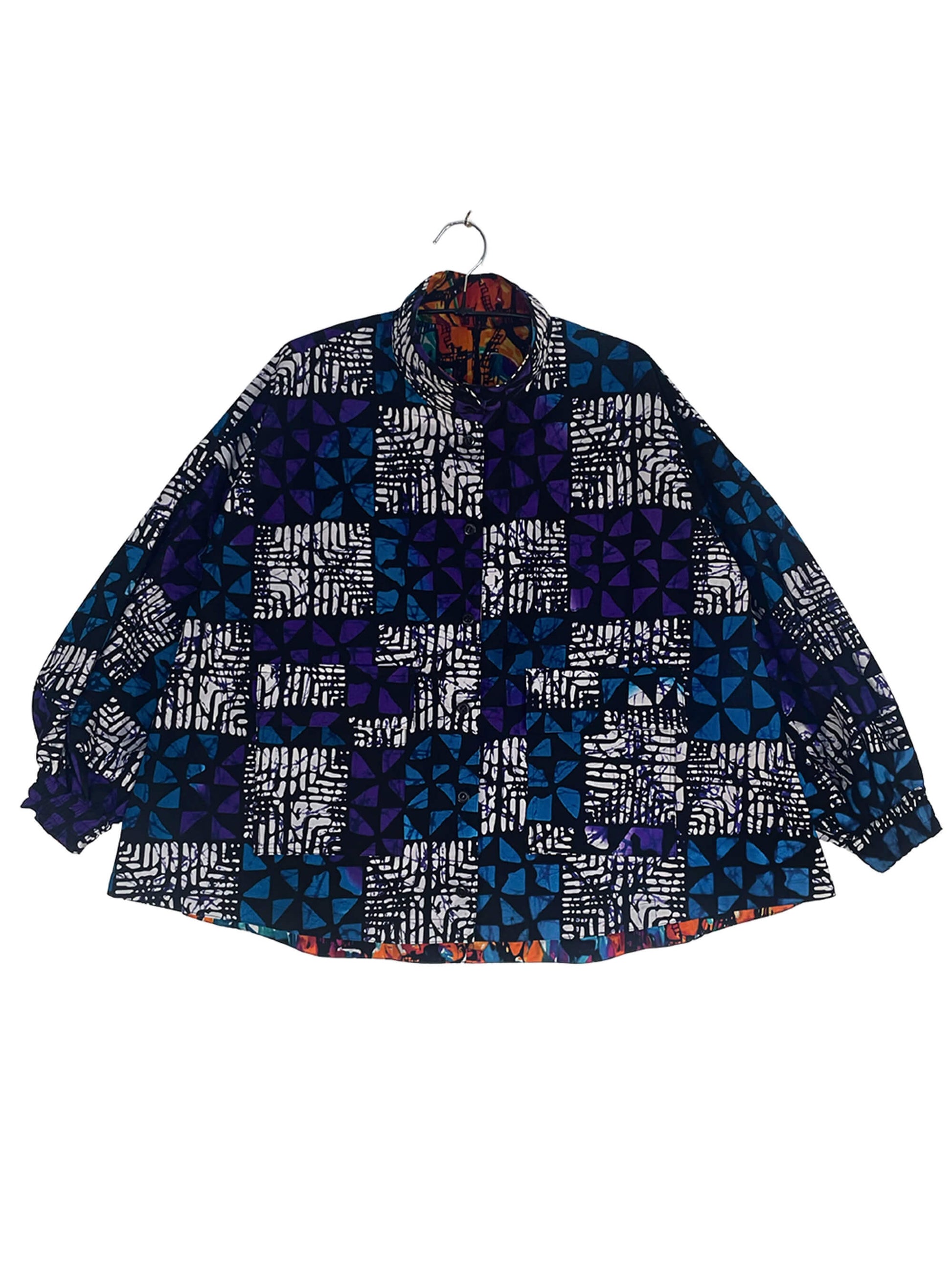 2色のキテンゲを使用し、リバーシブルで着こなしの表情を変えられるブルゾンジャケット。クラシカルなハイネックとボリュームスリーブのバランスが絶妙で、羽織るだけでスタイリングの主役になります。襟はそのまま立ててエレガントに、折り返して裏地を見せてシャツカラー風にすることも可能です