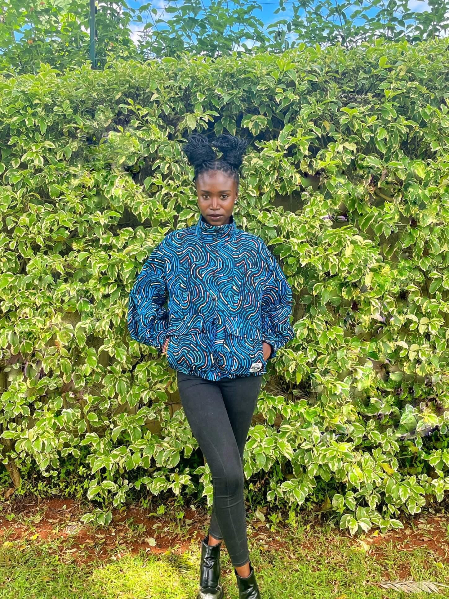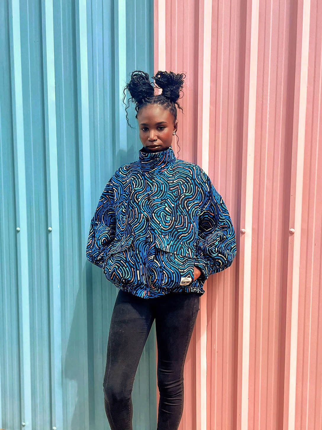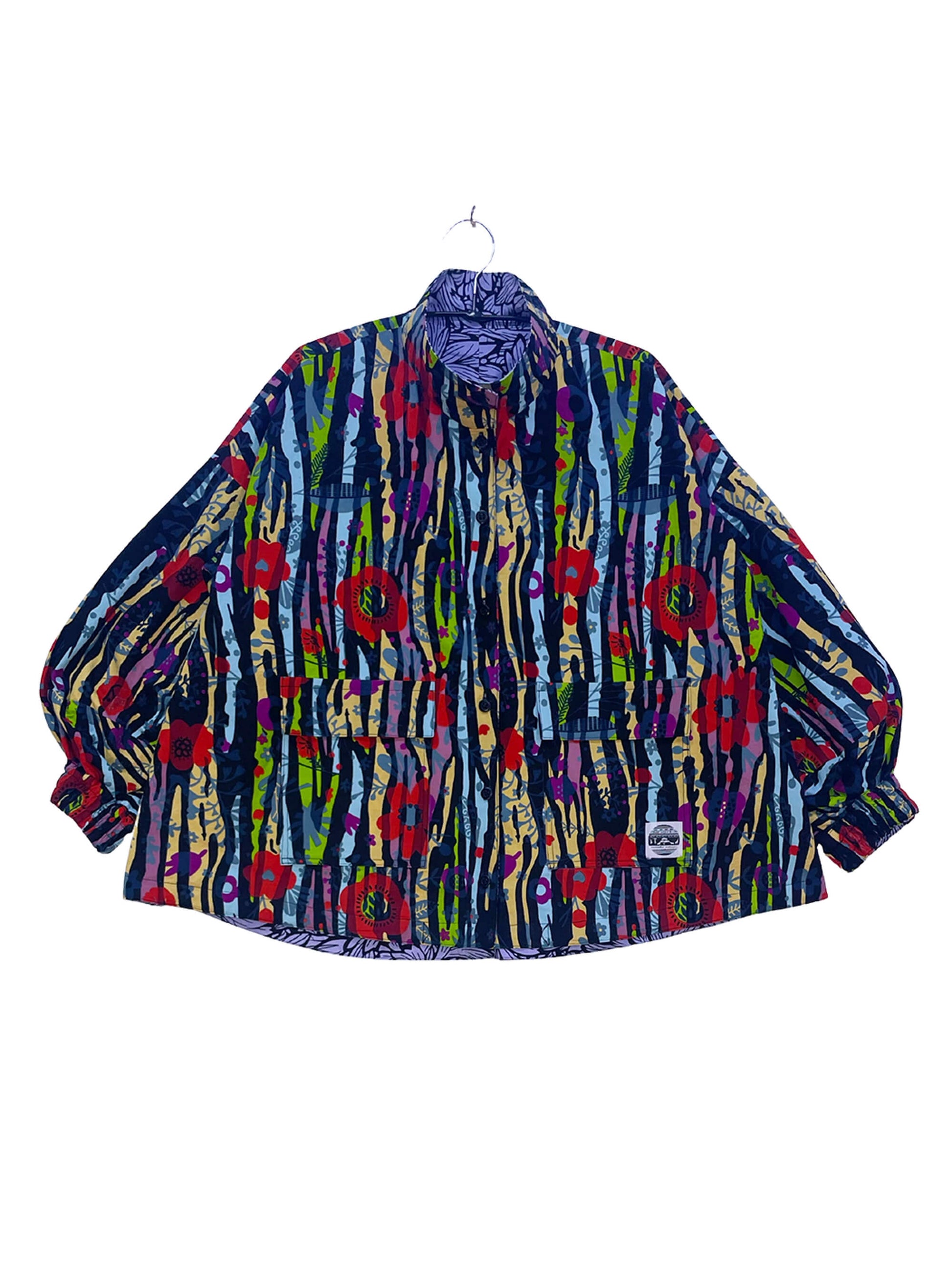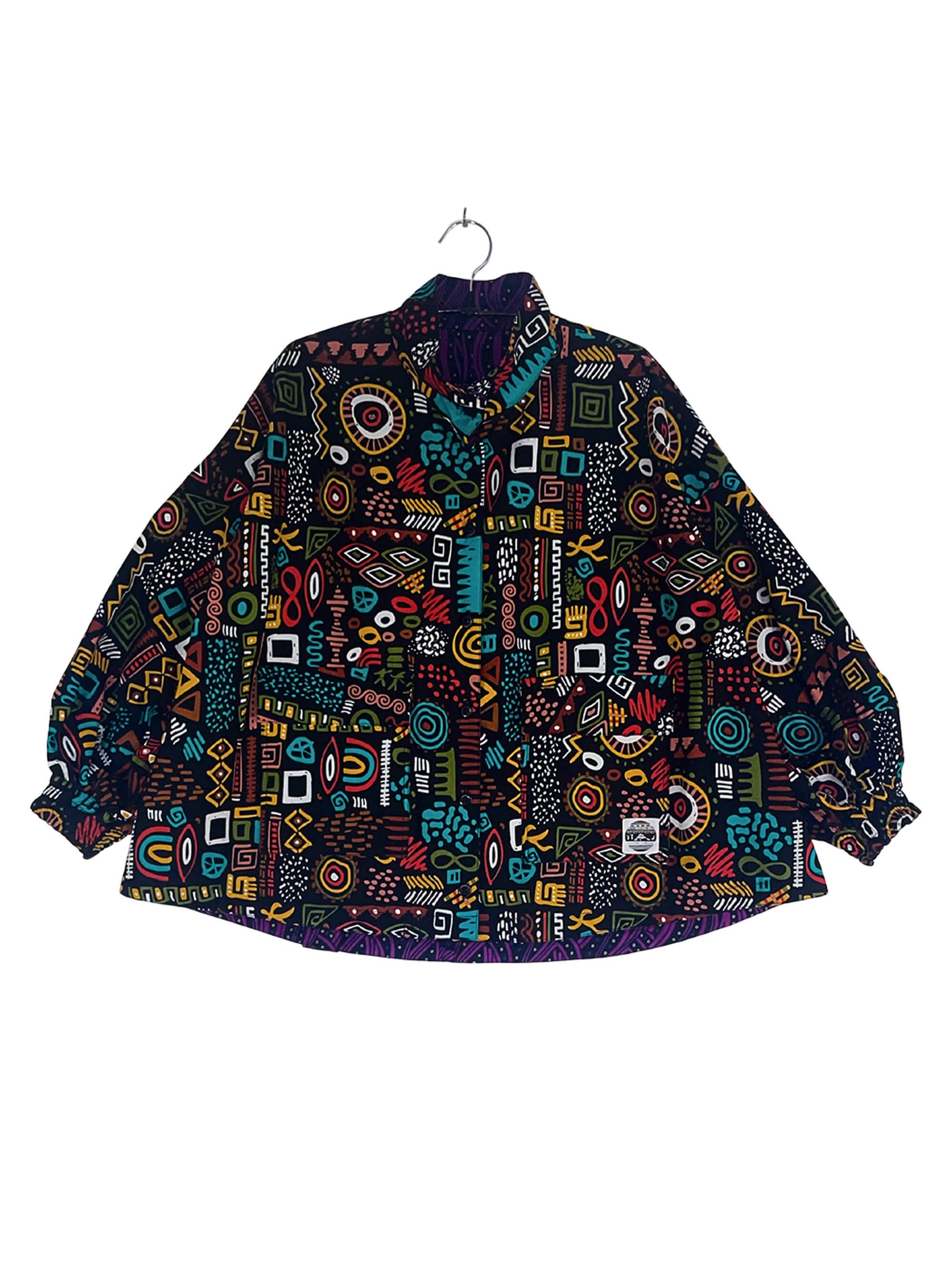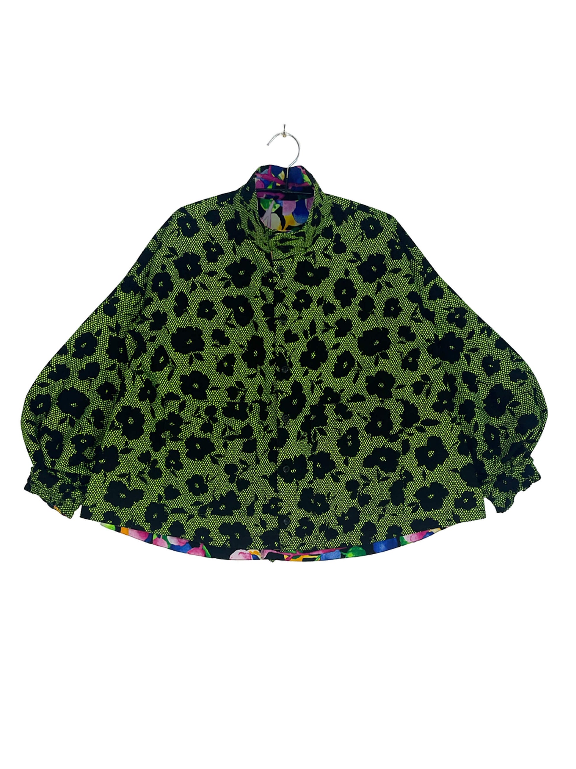2色のキテンゲを使用し、リバーシブルで着こなしの表情を変えられるブルゾンジャケット。クラシカルなハイネックとボリュームスリーブのバランスが絶妙で、羽織るだけでスタイリングの主役になります。襟はそのまま立ててエレガントに、折り返して裏地を見せてシャツカラー風にすることも可能です
