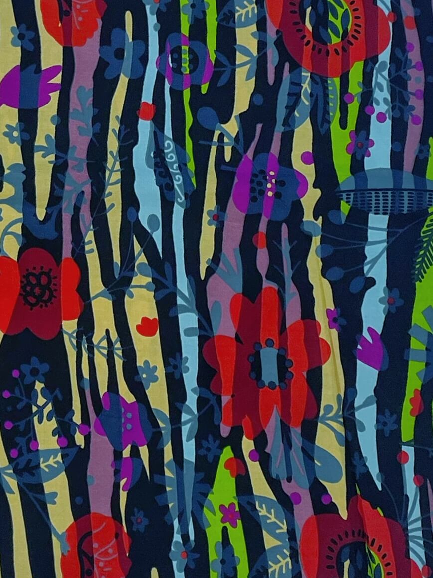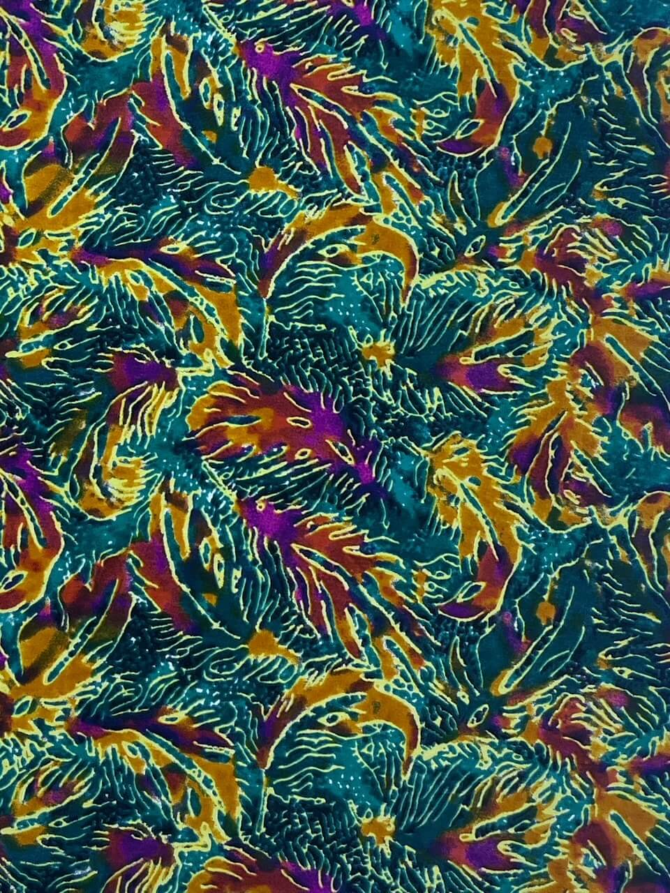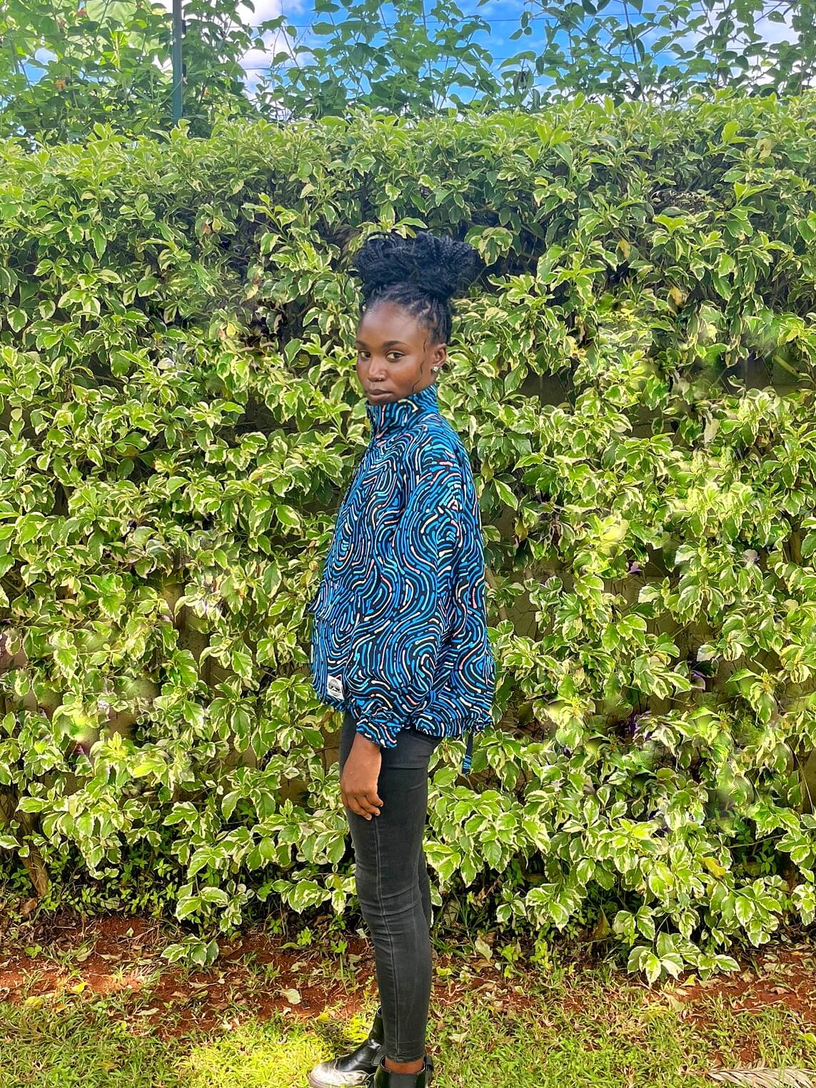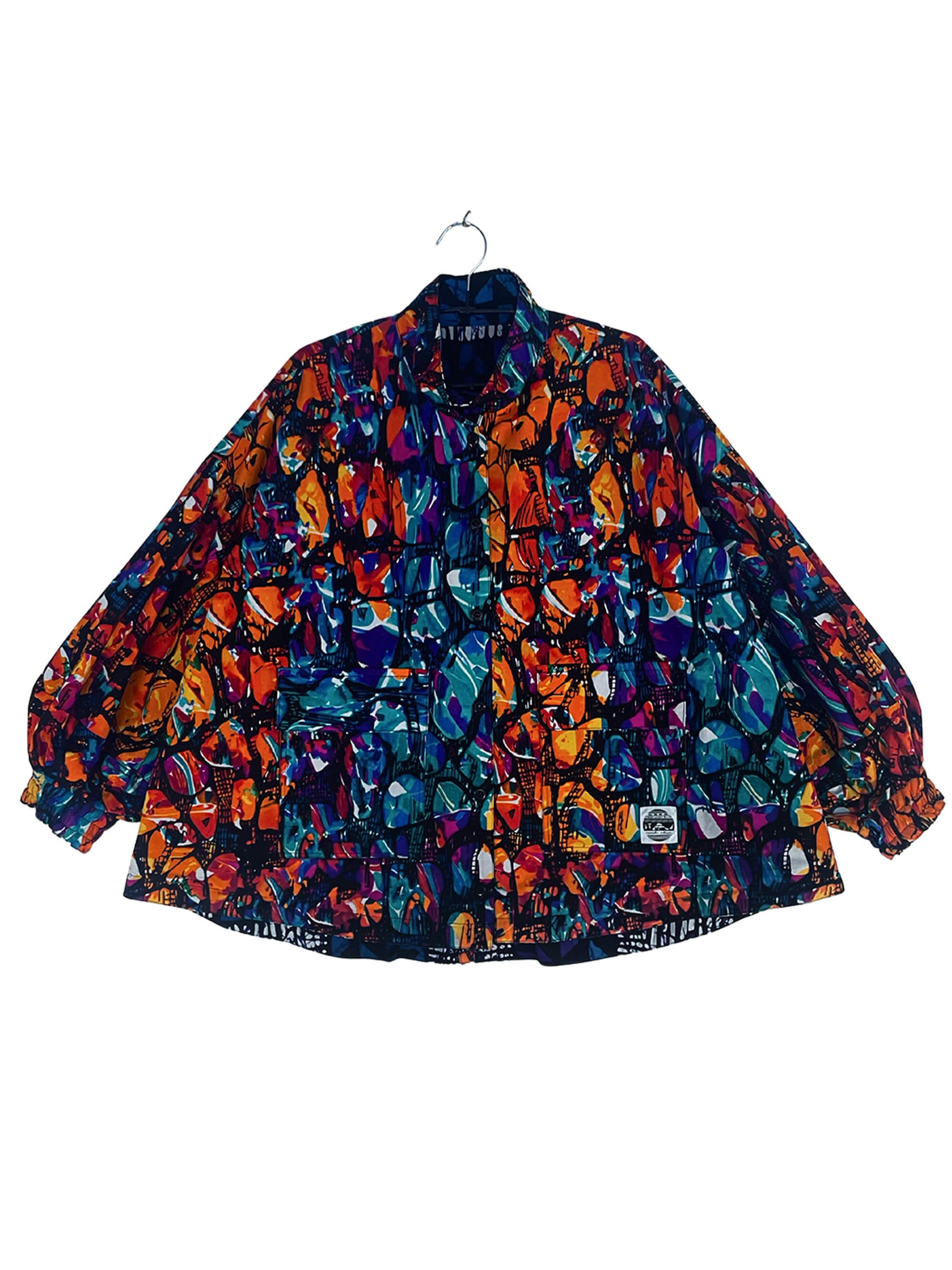 2色のキテンゲを使用し、リバーシブルで着こなしの表情を変えられるブルゾンジャケット。クラシカルなハイネックとボリュームスリーブのバランスが絶妙で、羽織るだけでスタイリングの主役になります。襟はそのまま立ててエレガントに、折り返して裏地を見せてシャツカラー風にすることも可能です