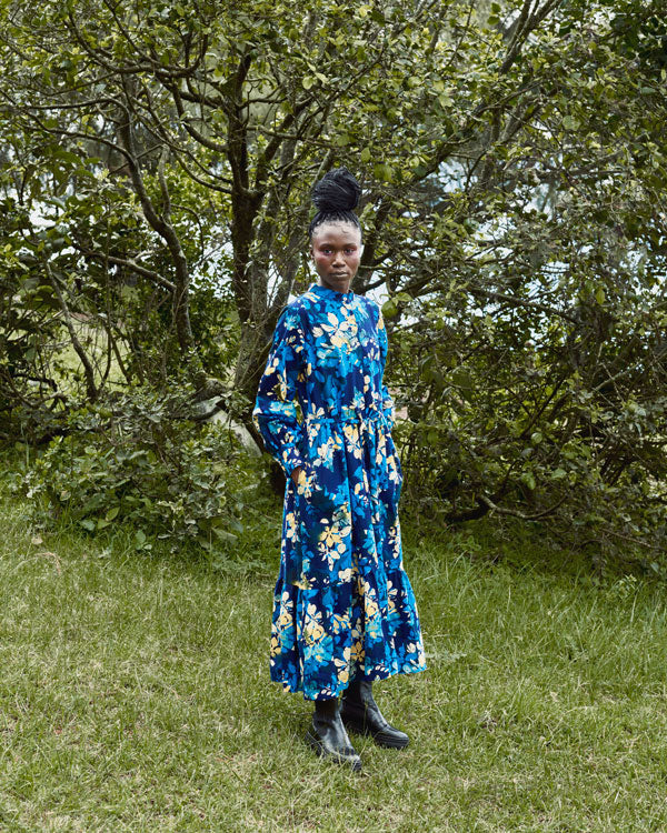 スタンドカラーが凛とした印象を与える、nomadic artisanの定番ワンピース。