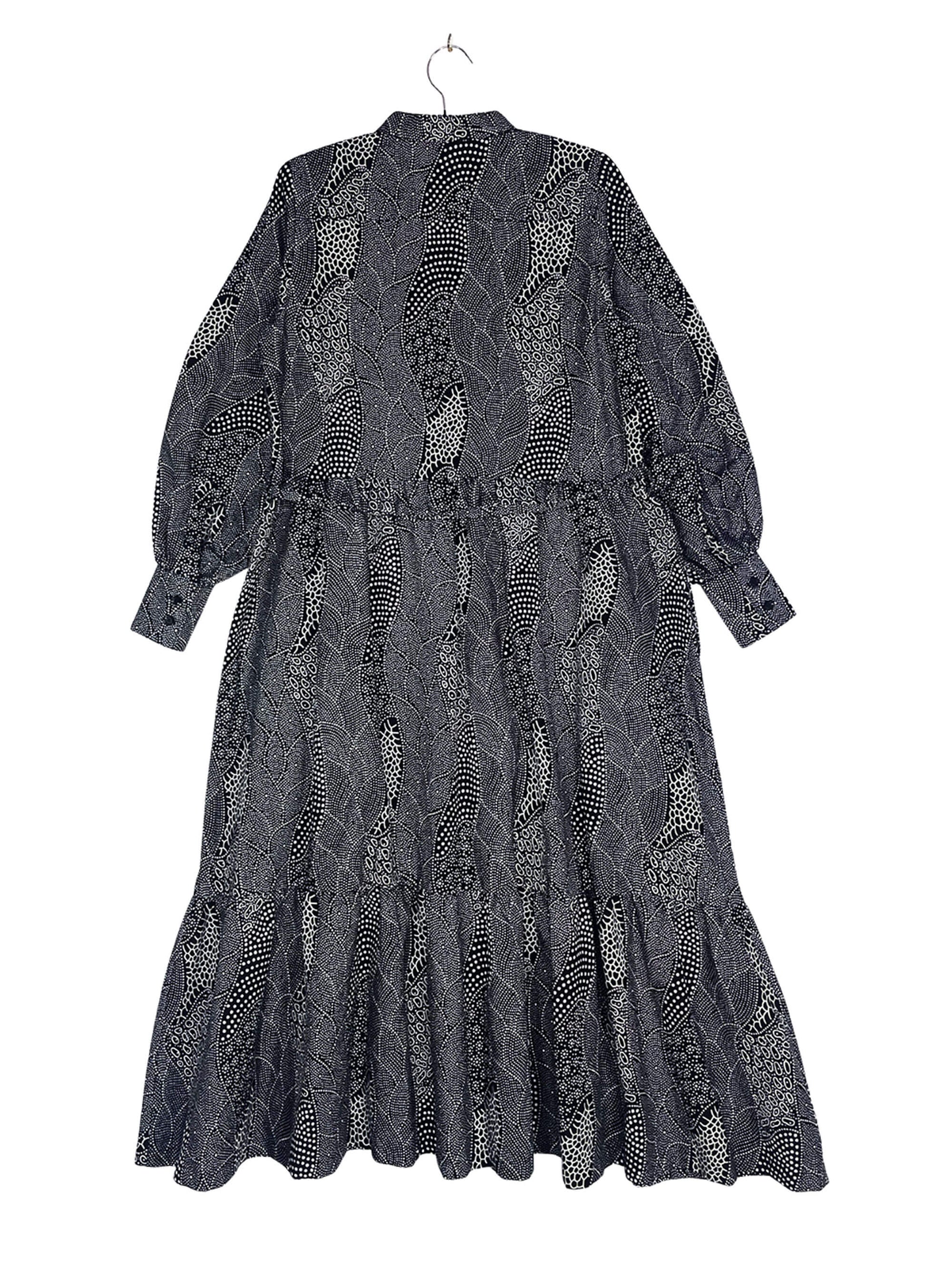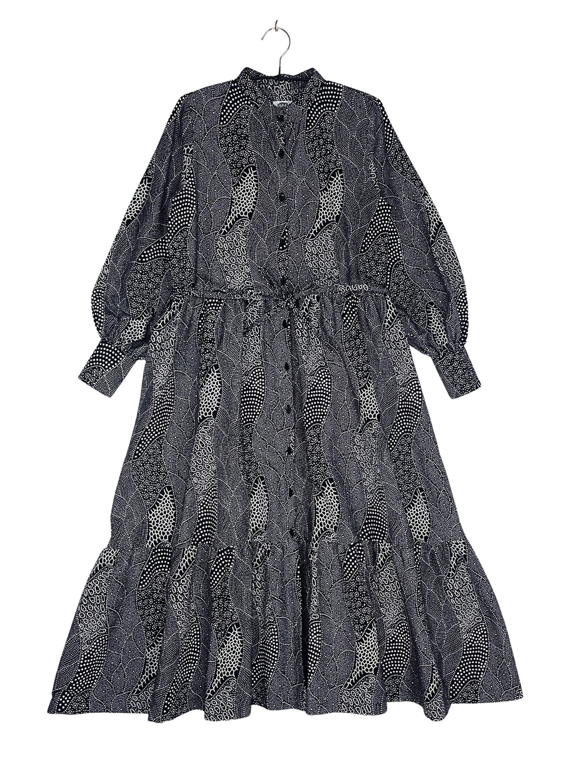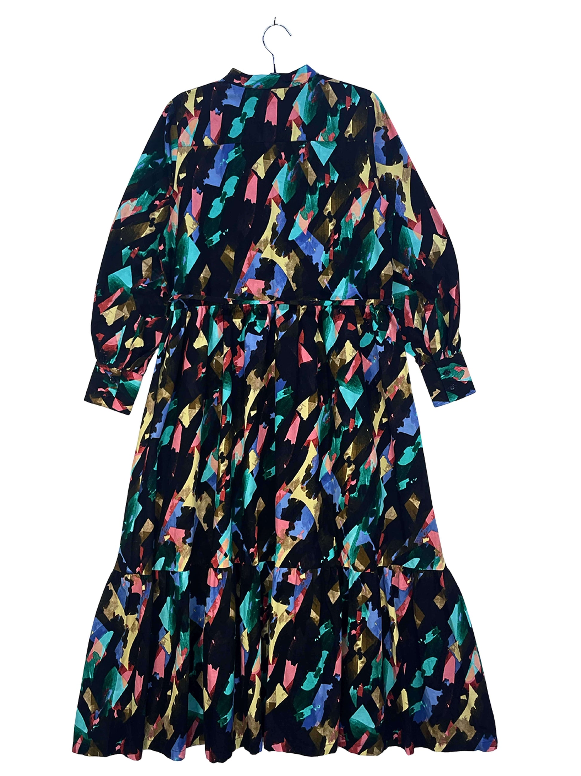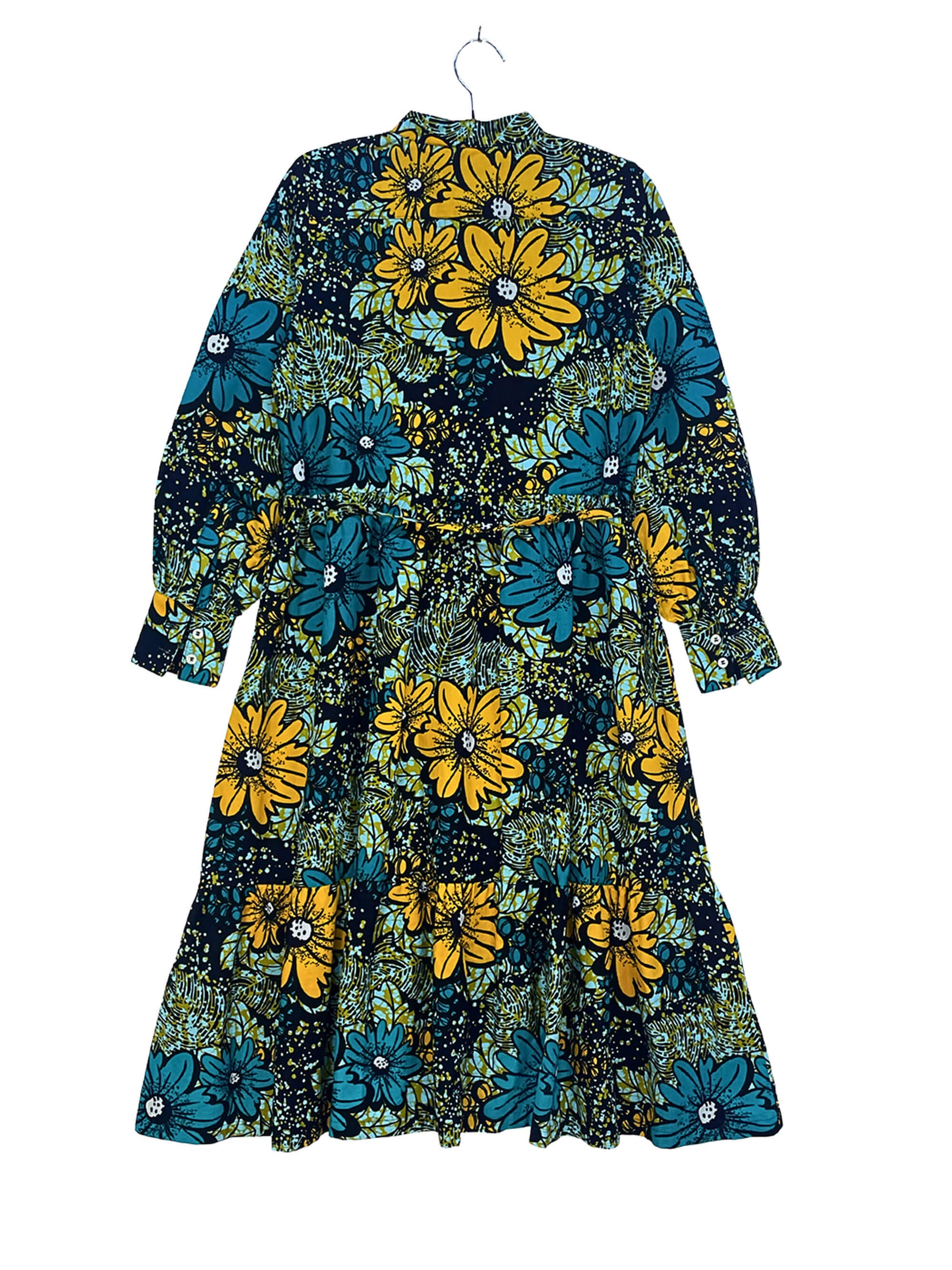 程よいボリュームのバルーンスリーブと、二段ティアード仕様のスカートが、全体に自然な立体感を与えます。
