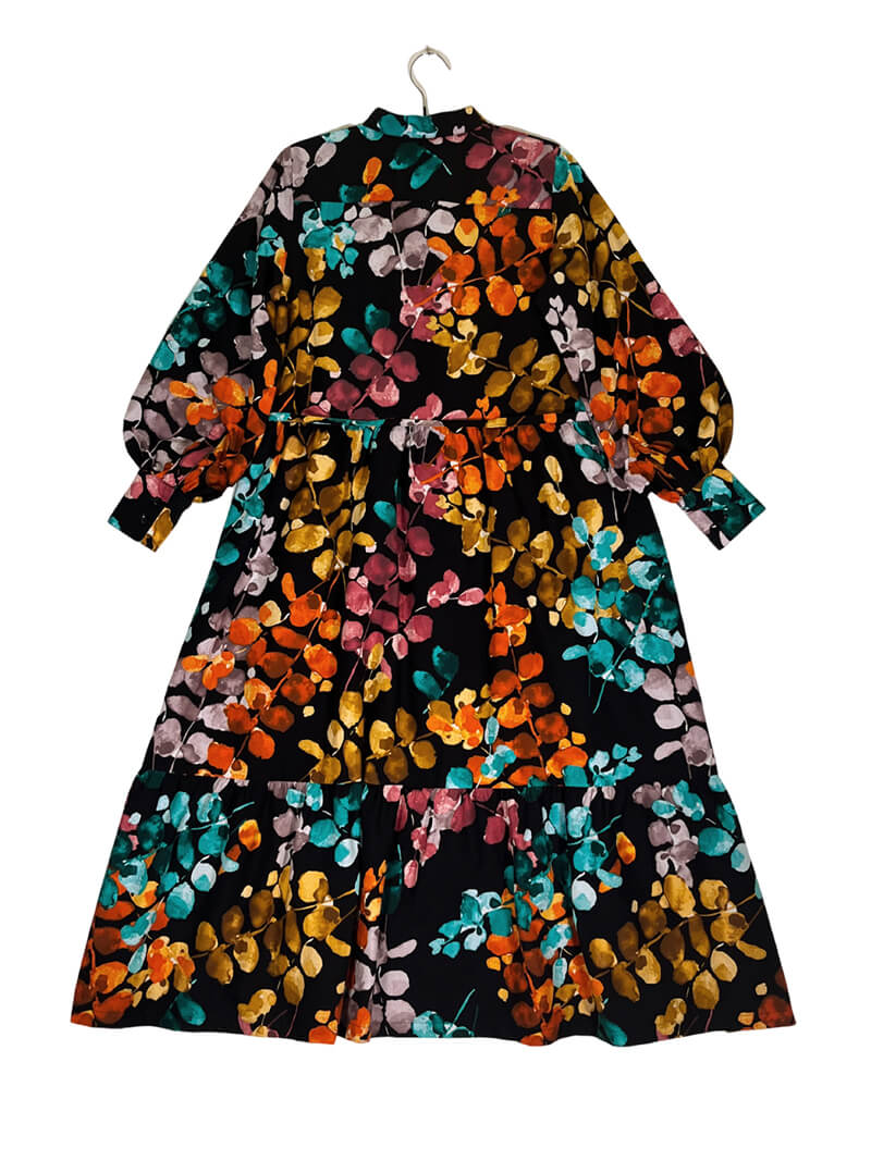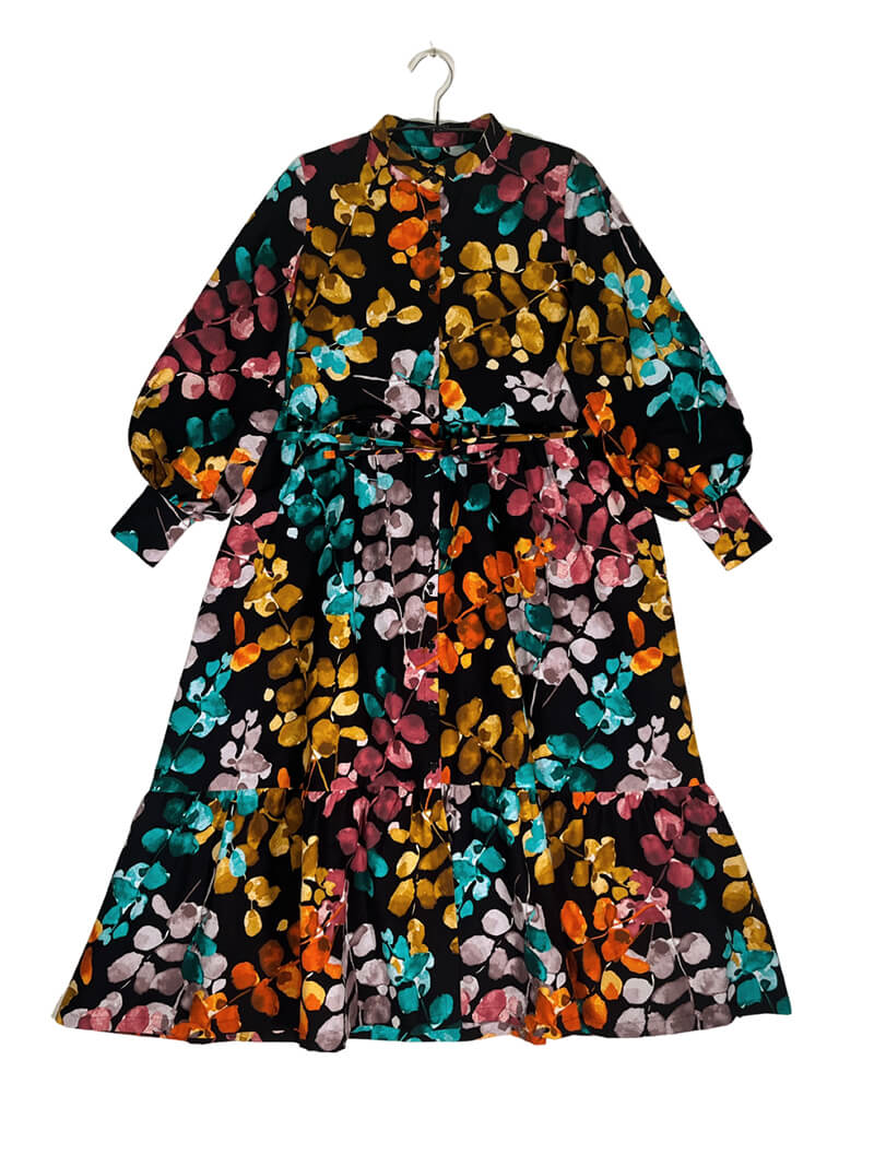ワンピースとしても、ロングカーディガンとしても活躍するシャツワンピも、立ち襟とバルーン袖で個性的に。3レイヤーの裾に向かって広がる華やかなティアードのシルエットは、取り外し可能のリボンでウェストマークしてスッキリとした着こなしにも。両サイドポケット付き。