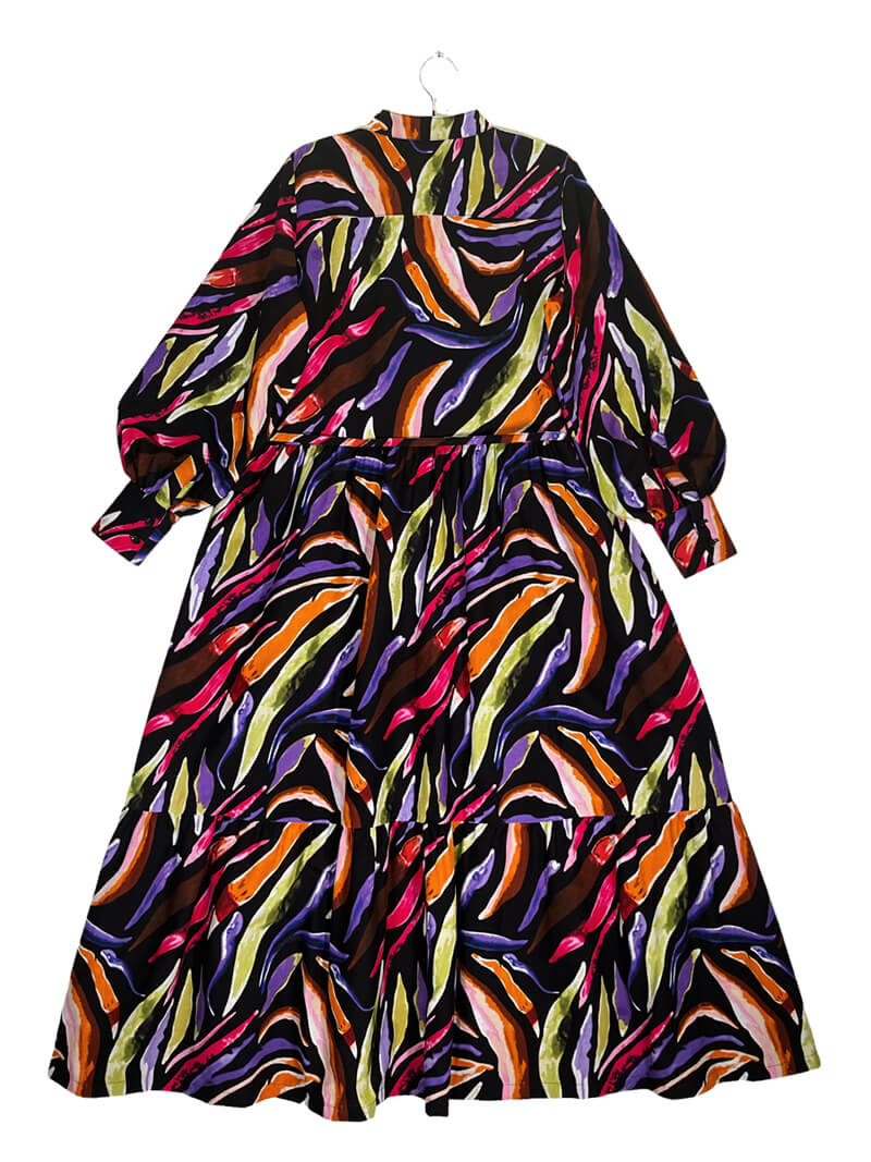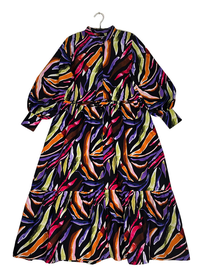 ワンピースとしても、ロングカーディガンとしても活躍するシャツワンピも、立ち襟とバルーン袖で個性的に。3レイヤーの裾に向かって広がる華やかなティアードのシルエットは、取り外し可能のリボンでウェストマークしてスッキリとした着こなしにも。両サイドポケット付き。