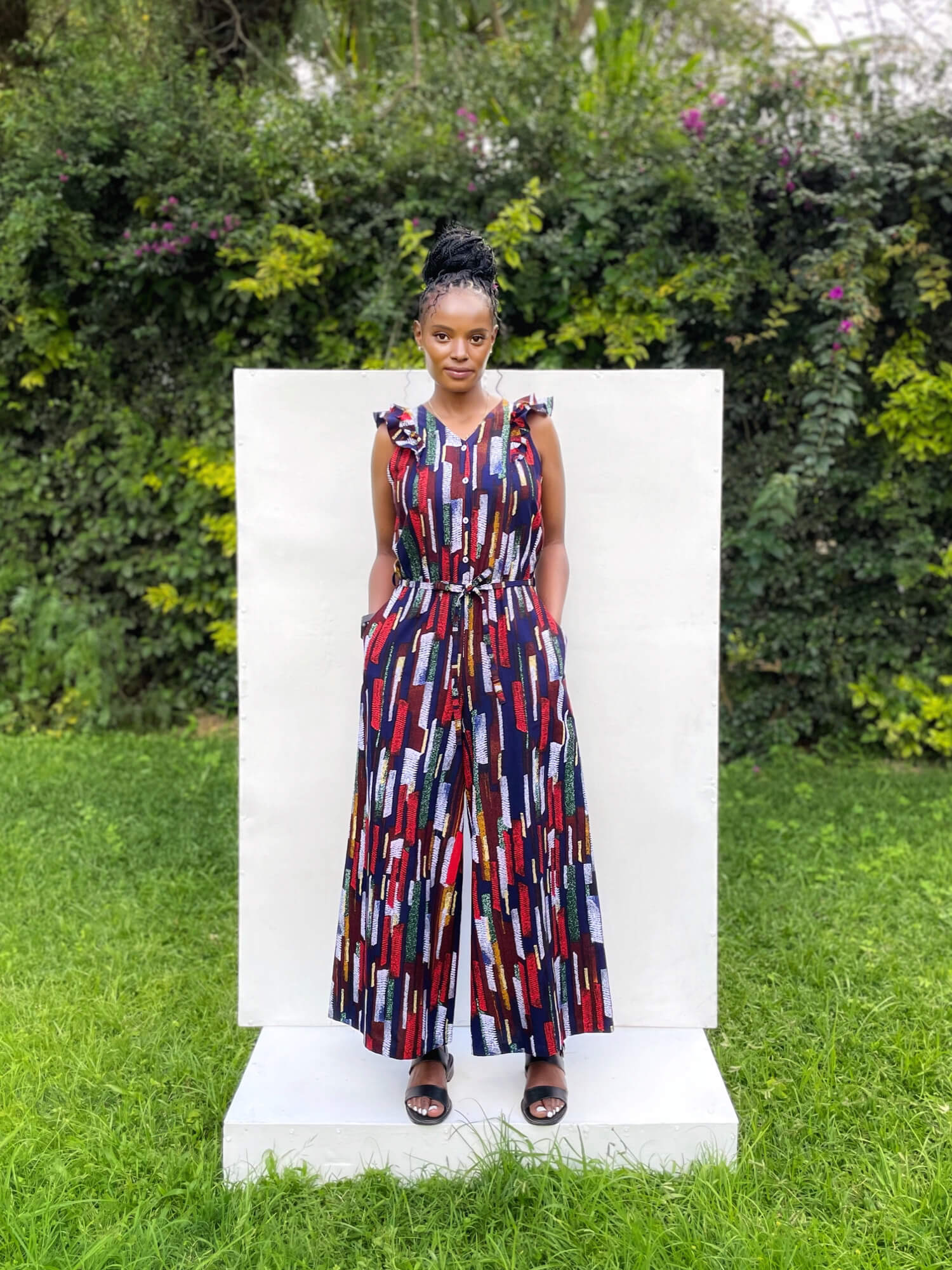 マキシ丈で仕立てたワイドレッグジャンプスーツ。程よくフレアを効かせたパンツは足さばきがよく、汗ばむ季節でも風が通り快適に着られます。