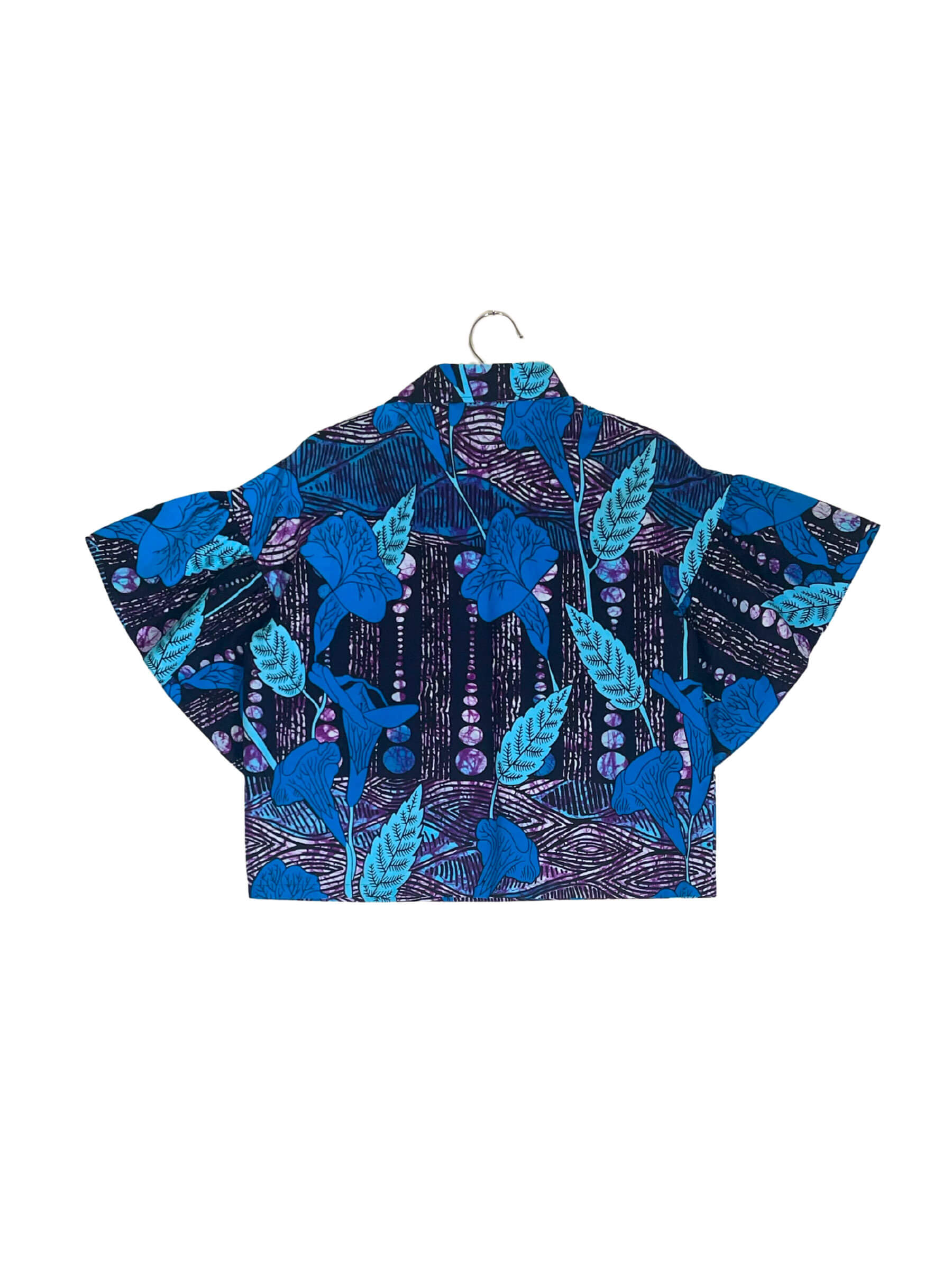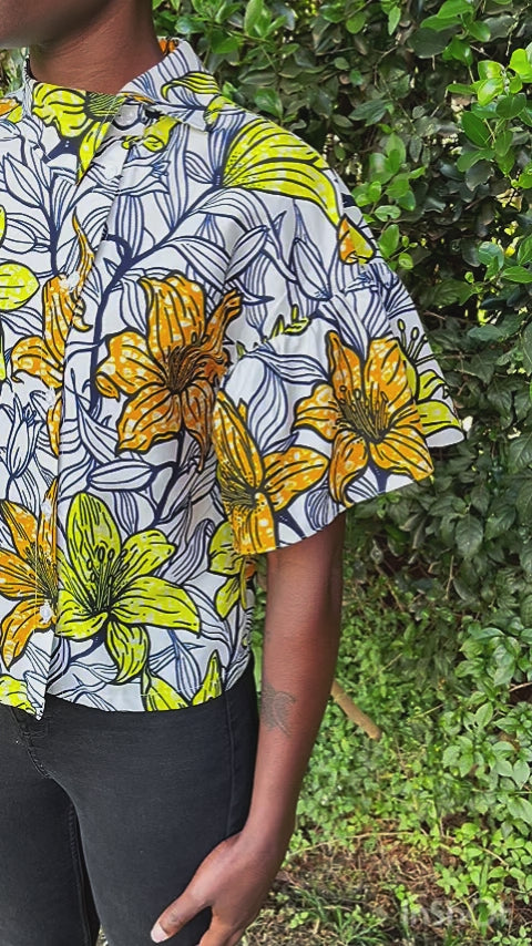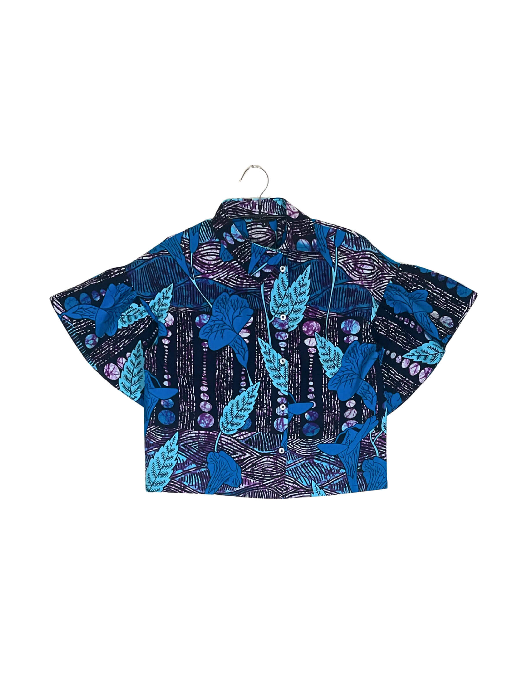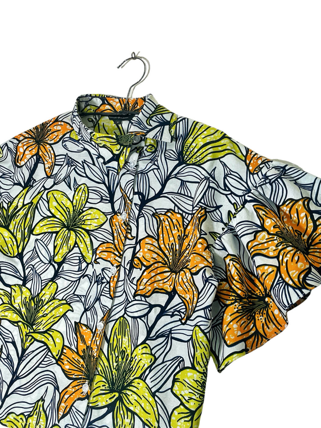 A short-sleeved collared shirt with a regular length, but it has a twist. The playful asymmetrical collar and button position accent your style. The sleeves that continue from the drop shoulders have a flared design. This top will grant your wish of being simple but different from everyone else.