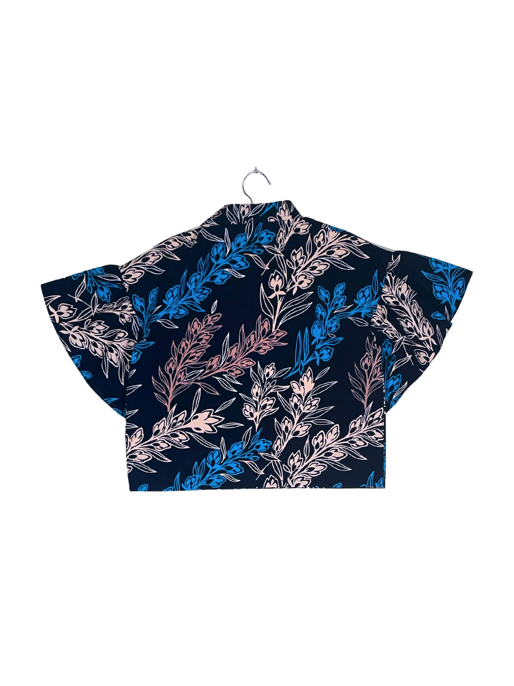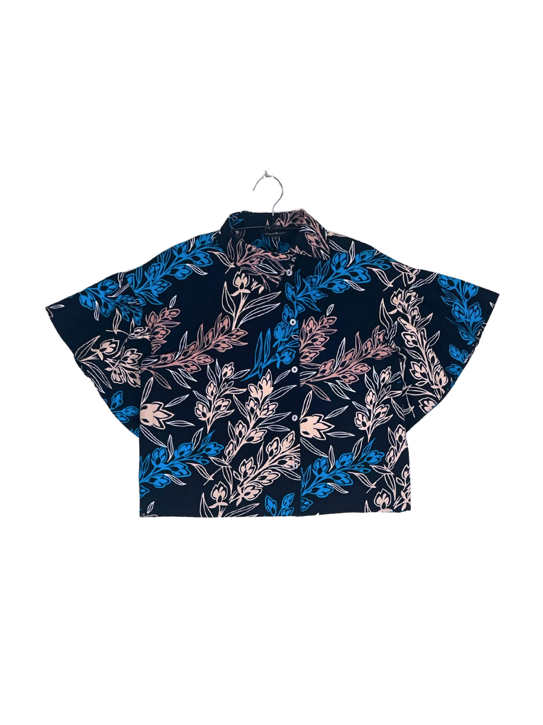 A short-sleeved collared shirt with a regular length, but it has a twist. The playful asymmetrical collar and button position accent your style. The sleeves that continue from the drop shoulders have a flared design. This top will grant your wish of being simple but different from everyone else.