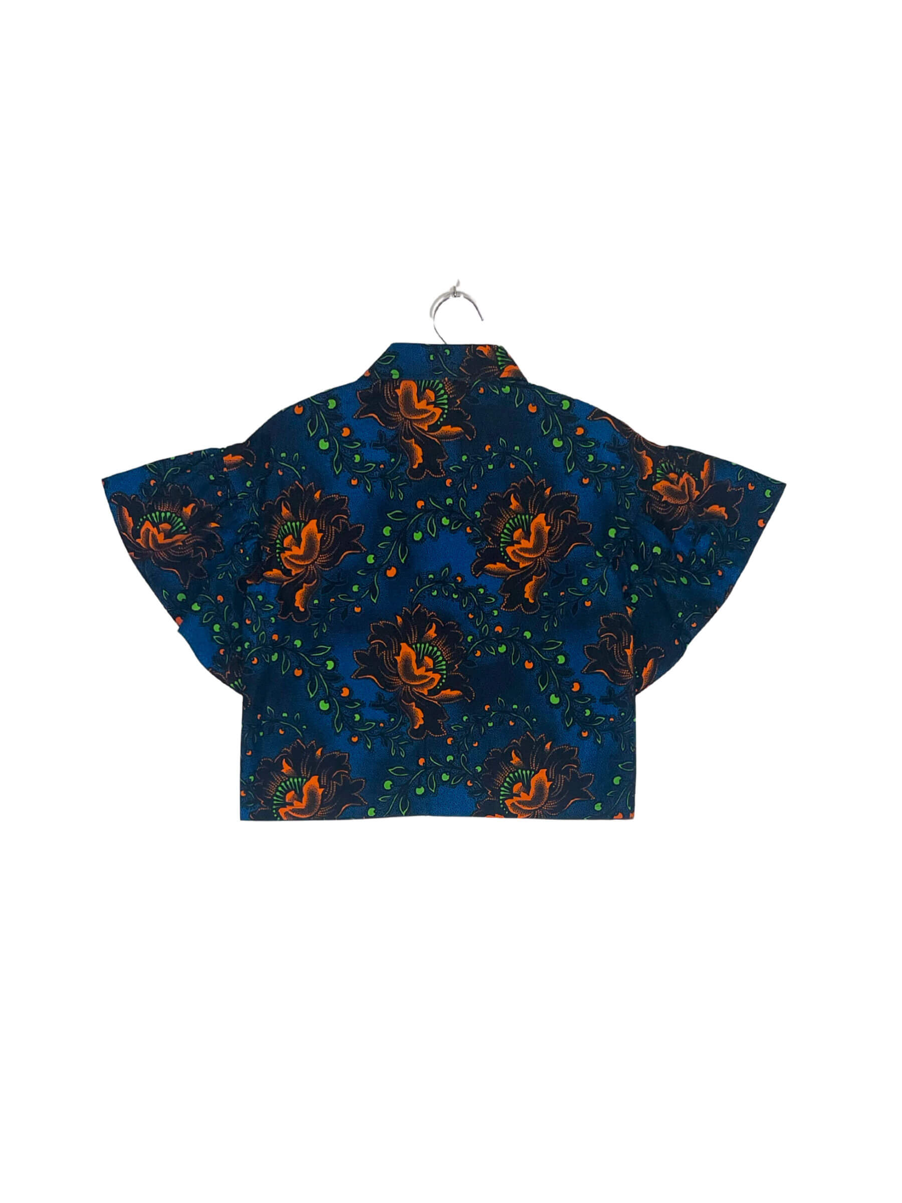 A short-sleeved collared shirt with a regular length, but it has a twist. The playful asymmetrical collar and button position accent your style. The sleeves that continue from the drop shoulders have a flared design. This top will grant your wish of being simple but different from everyone else.