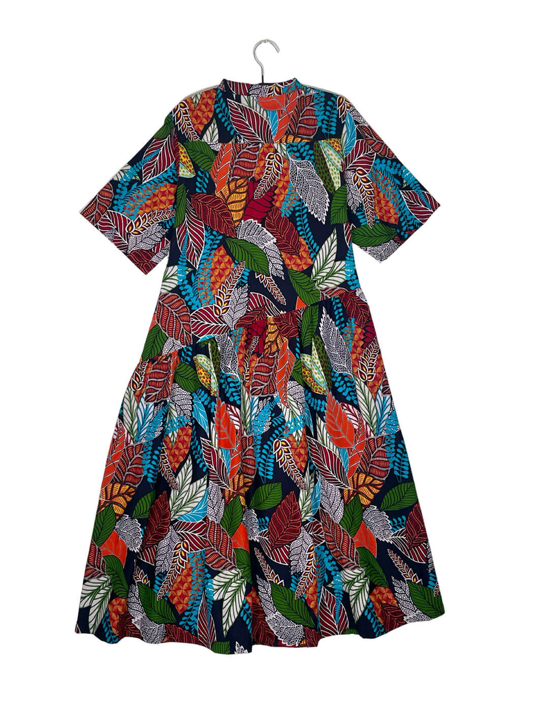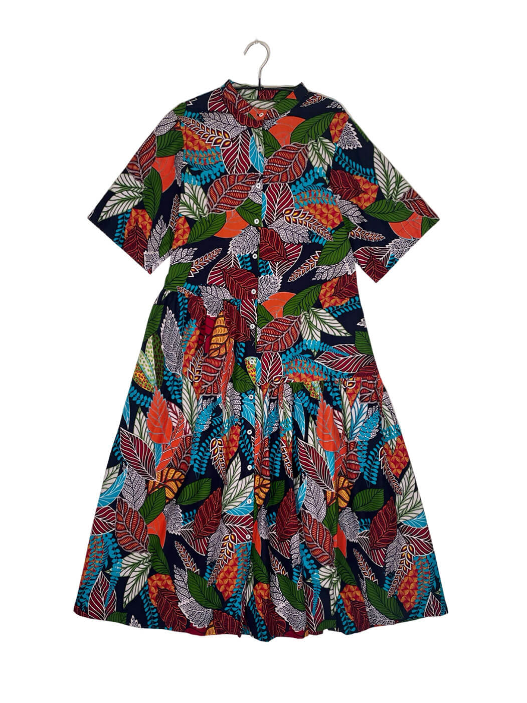 Our most popular item Shirt Dress's summer version has just arrived! With the trademark stand collar remaining, the I-line top gives it a skinnier silhouette, and the gathered skirt part has just the right amount of volume. The switching part of tops and bottoms are asymmetrically placed; the right side is below the waist, and the left is above the knee, giving it a unique look. Half-length sleeves are also great for protection from the sun. It can be worn in 2 ways, as a comfortable voluminous dress, and also as a cardigan.