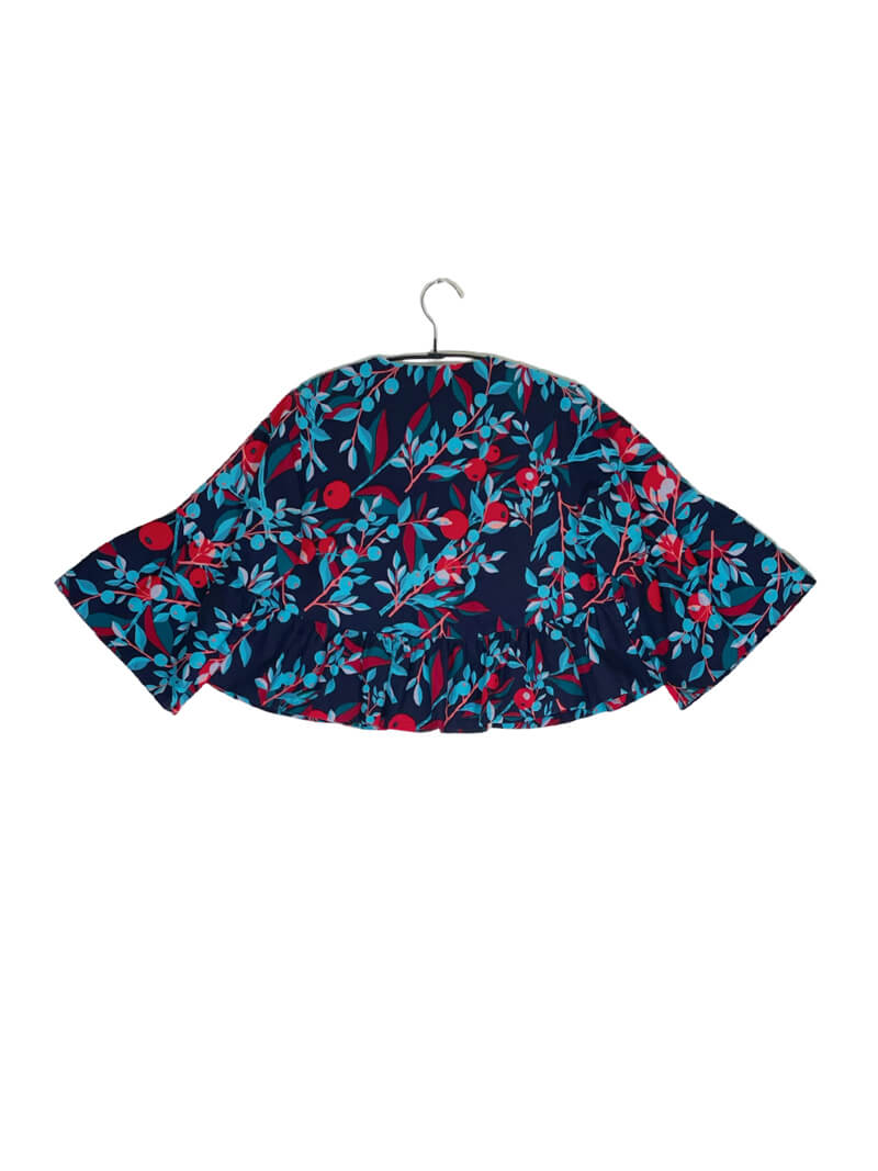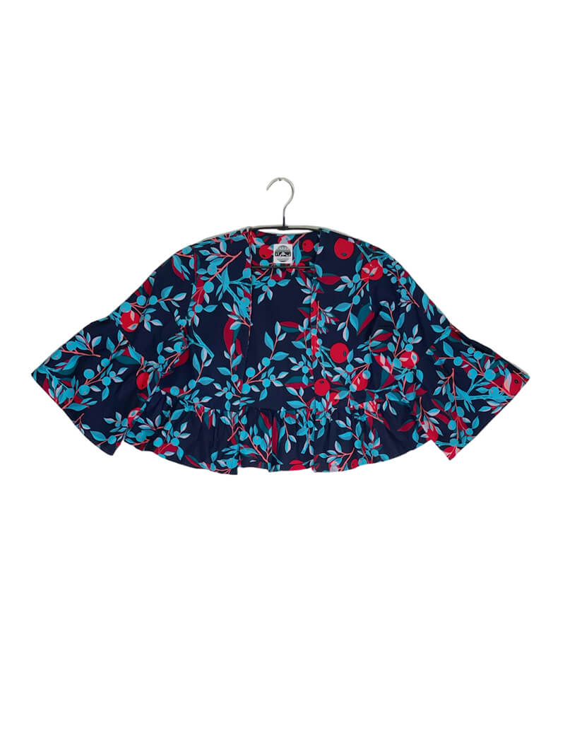 This cropped 3/4 sleeve jacket can accent your styling. The jacket's unique bell-shaped sleeves and ruffles at the hem give it a neat but also gorgeous look.