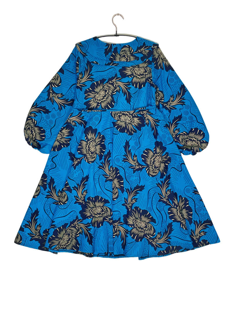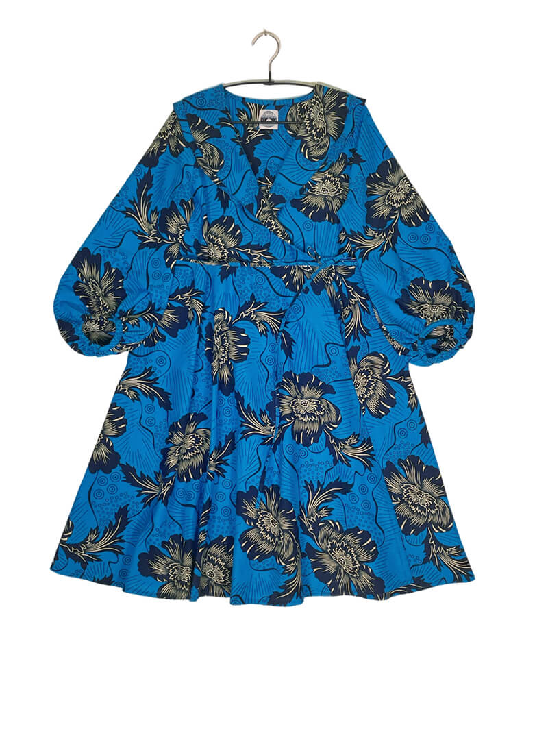 A dress with a beautifully swaying flared skirt and perfectly rounded bishop sleeves. Since the bottom is a wrap skirt, it is not only easy to put on and take off, but also the chest opening and waist can be adjusted freely. You can tie the ribbon at the waist as it is for a loose A-line look, or wrap it around to mark the waist for a neat look. The double-layered collar gives it a unique look from the back and side.