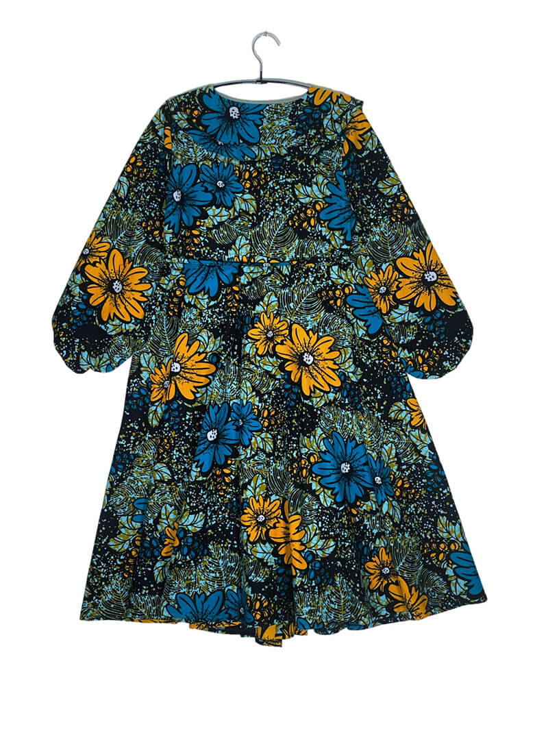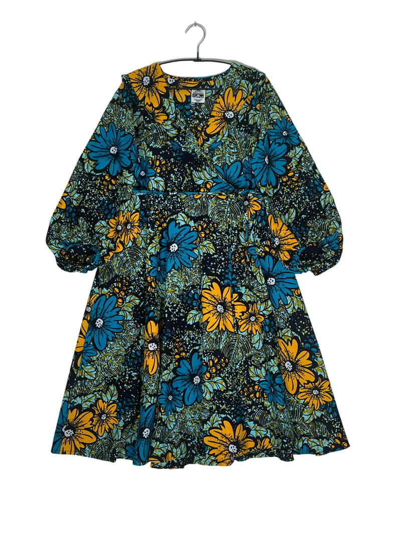 A dress with a beautifully swaying flared skirt and perfectly rounded bishop sleeves. Since the bottom is a wrap skirt, it is not only easy to put on and take off, but also the chest opening and waist can be adjusted freely. You can tie the ribbon at the waist as it is for a loose A-line look, or wrap it around to mark the waist for a neat look. The double-layered collar gives it a unique look from the back and side.