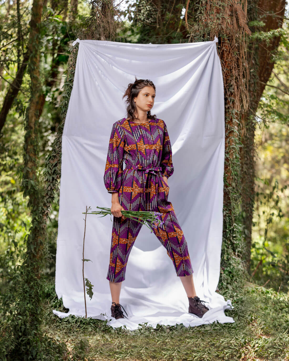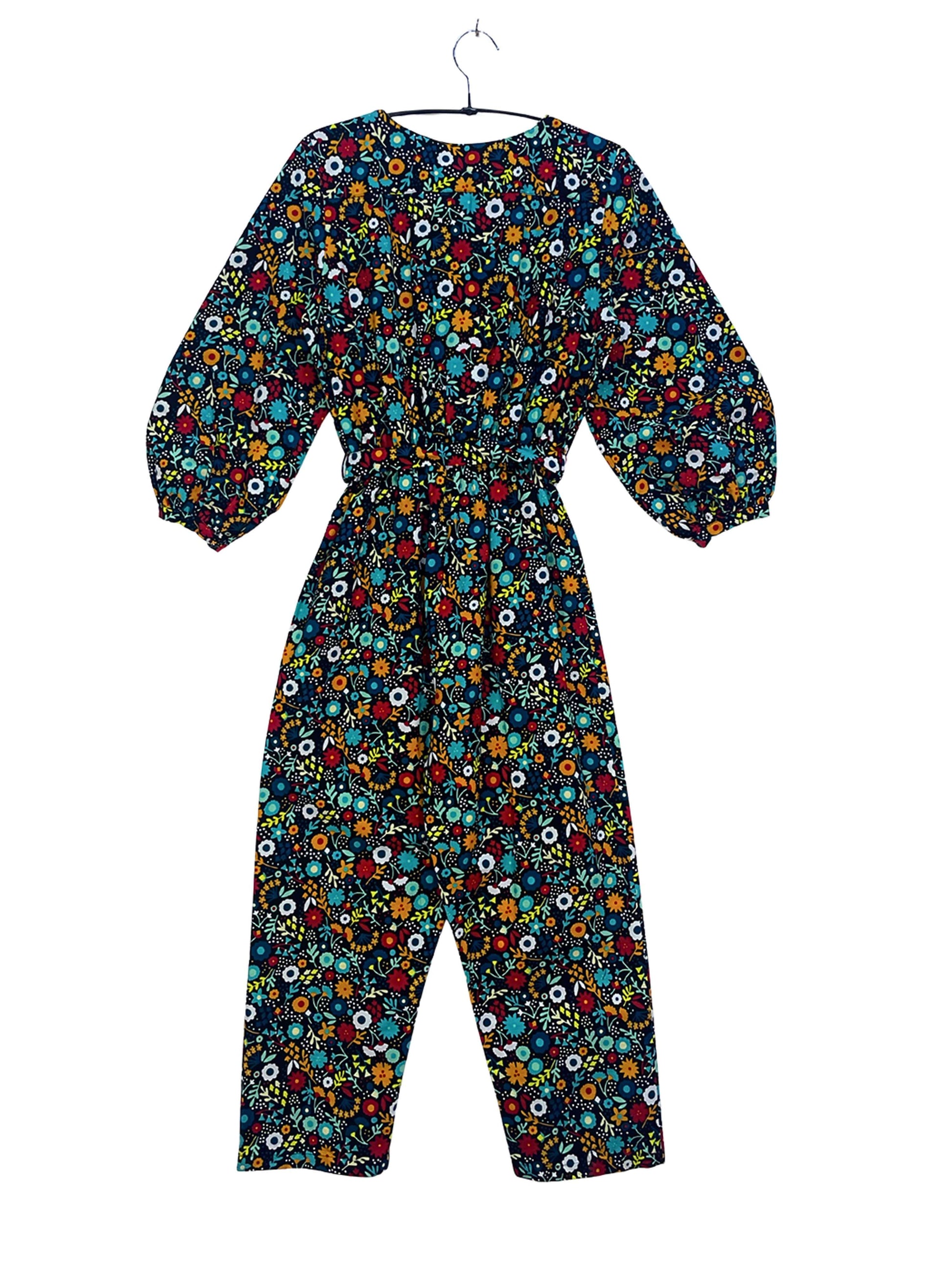 This jumpsuit features voluminous balloon sleeves and a hidden-button placket, blending soft, feminine details with clean, modern lines. The elasticated waist ensures a comfortable fit, while the included waist ribbon allows for further adjustment to create a flattering silhouette.