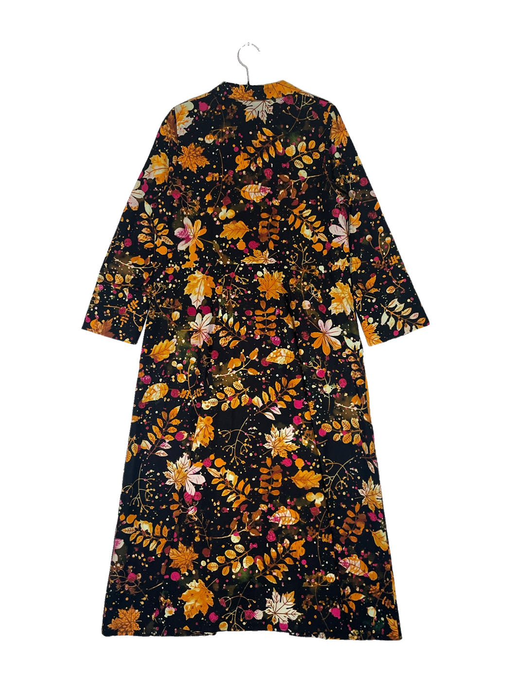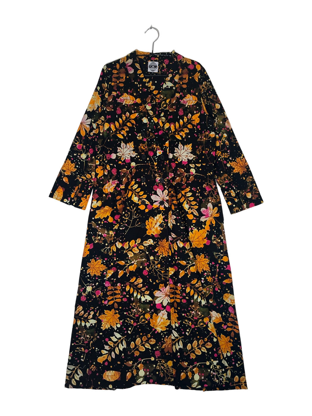 A maxi-length dress with a classic double-breasted front and shawl collar. The cuffs have a slit in the front, which allows the wrists to peek out as you move, creating an elegant look. Fold the cuffs back to make it 3/4 length for a more formal look. You can wear it as a loose A-line dress, or use the attached D-ring belt to mark your waist. This coat-like dress is useful as a light coat.