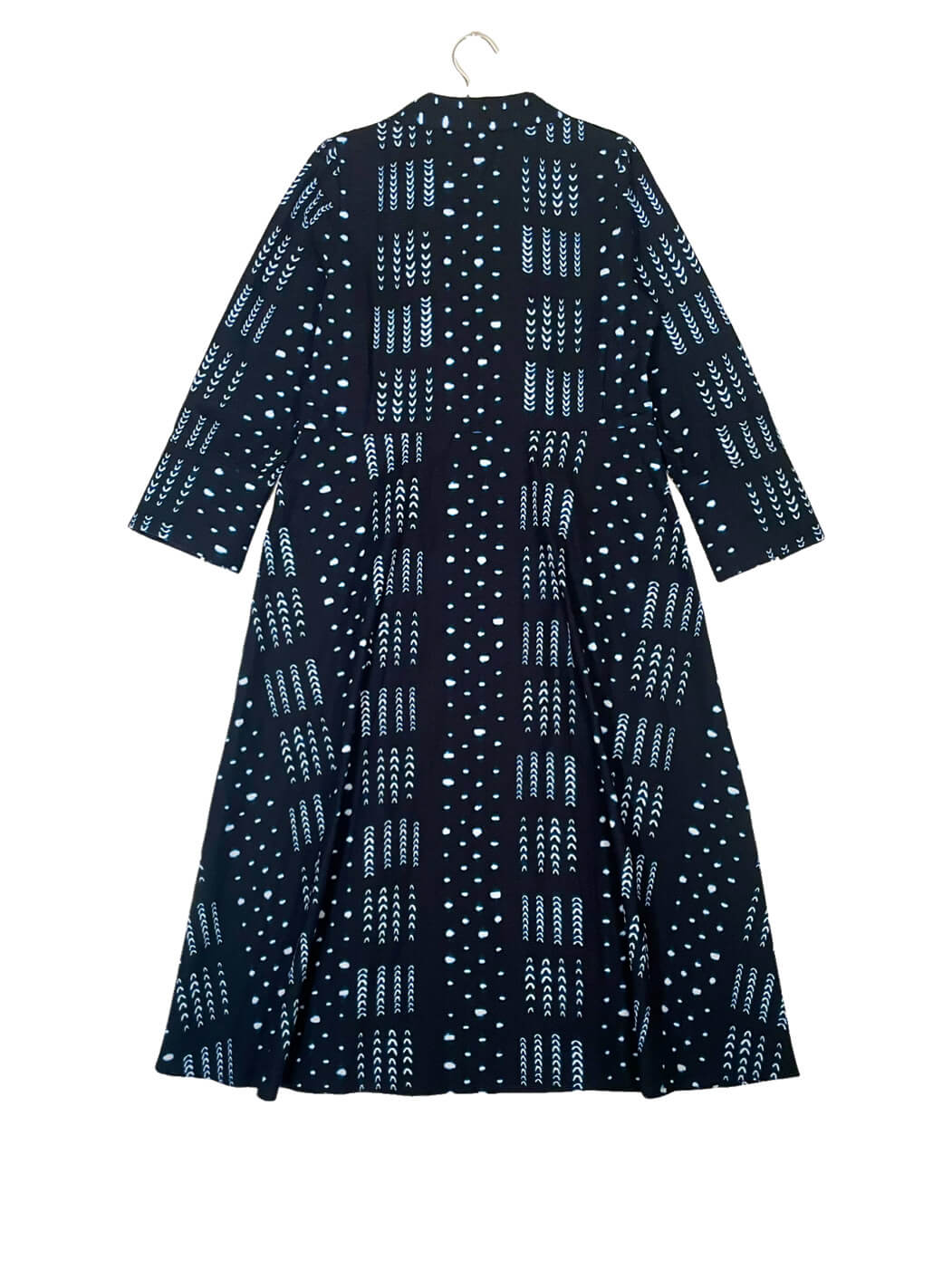 A maxi-length dress with a classic double-breasted front and shawl collar. The cuffs have a slit in the front, which allows the wrists to peek out as you move, creating an elegant look. Fold the cuffs back to make it 3/4 length for a more formal look. You can wear it as a loose A-line dress, or use the attached D-ring belt to mark your waist. This coat-like dress is useful as a light coat.