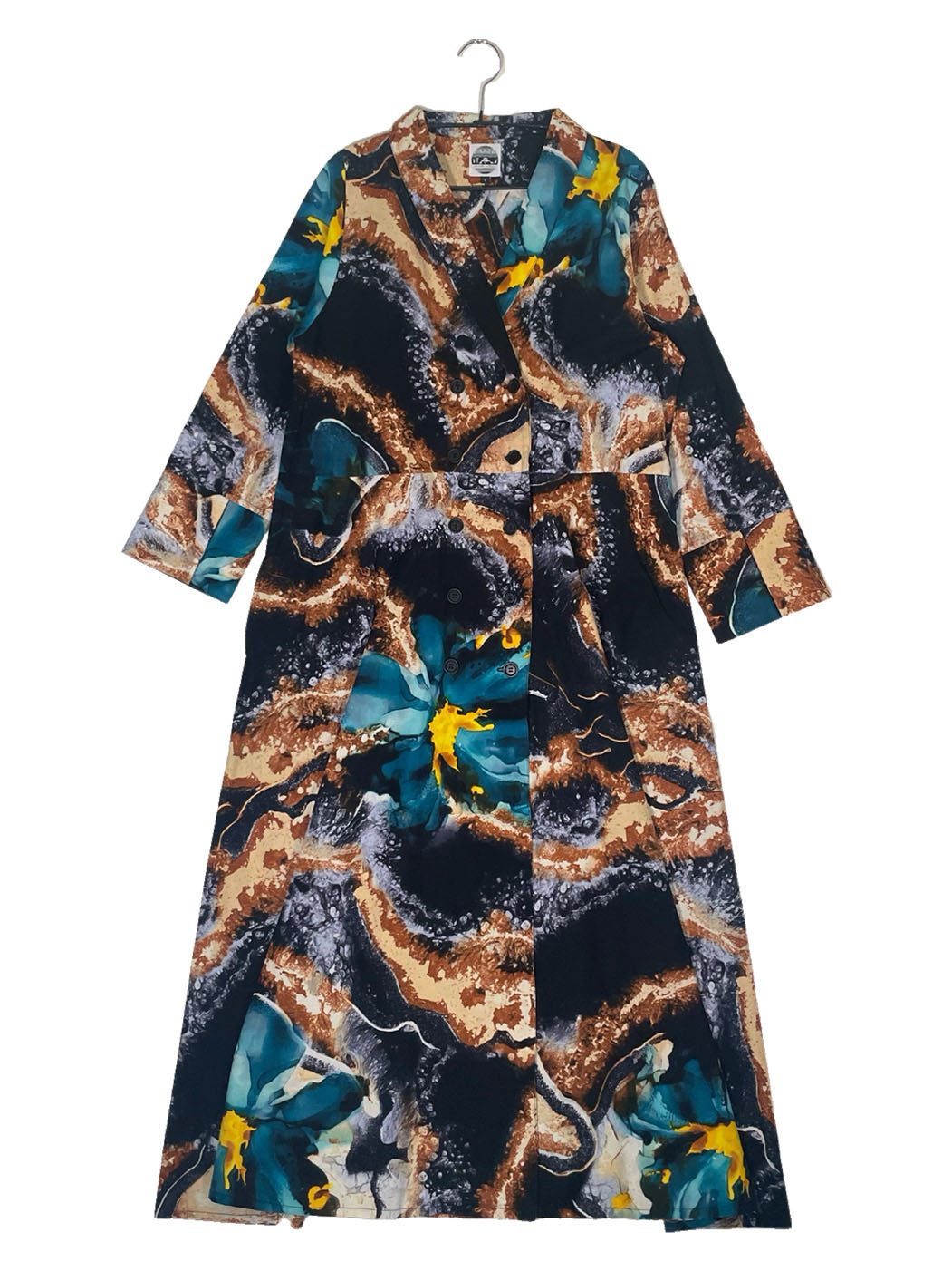 A maxi-length dress with a classic double-breasted front and shawl collar. The cuffs have a slit in the front, which allows the wrists to peek out as you move, creating an elegant look. Fold the cuffs back to make it 3/4 length for a more formal look. You can wear it as a loose A-line dress, or use the attached D-ring belt to mark your waist. This coat-like dress is useful as a light coat.