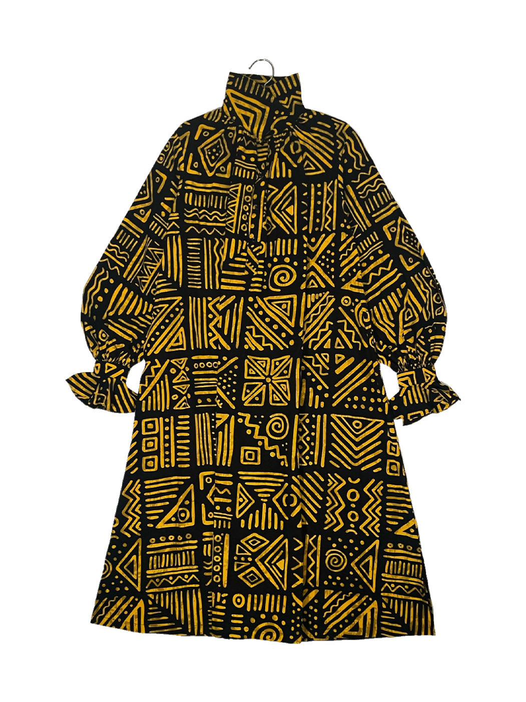 A retro-modern dress with a beautiful 3/4 length A-line silhouette, classical high-neck collar, and flared cuff sleeves. You can mark the waist with an attached ribbon. The high-neck collar can be folded into a normal shirt collar. It goes well with layering pants or a leggings style.