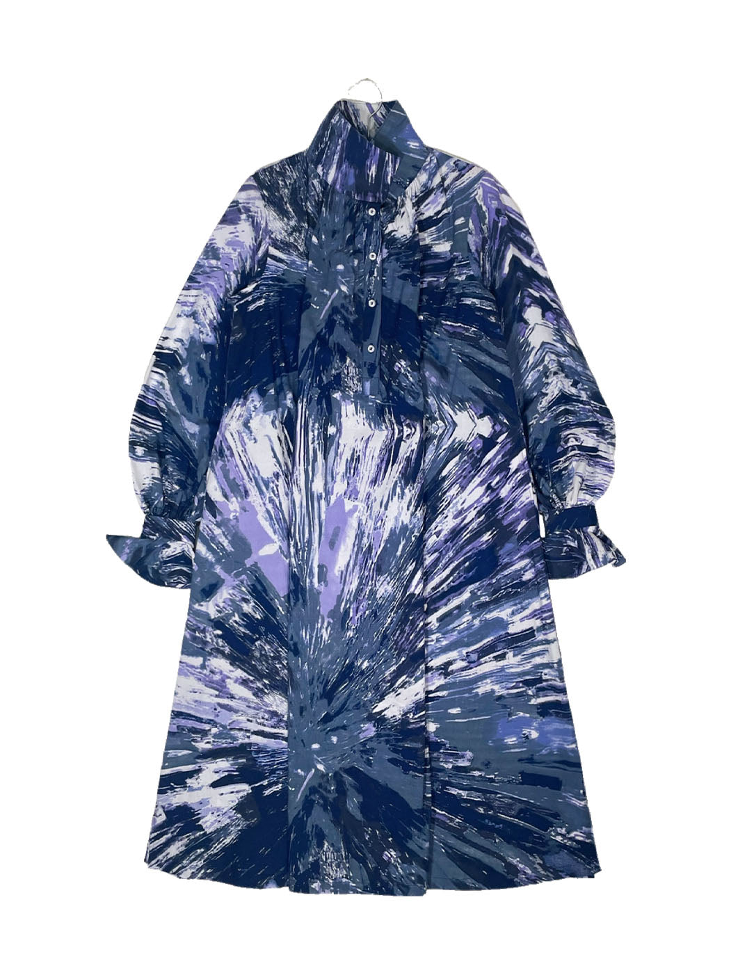 A retro-modern dress with a beautiful 3/4 length A-line silhouette, classical high-neck collar, and flared cuff sleeves. You can mark the waist with an attached ribbon. The high-neck collar can be folded into a normal shirt collar. It goes well with layering pants or a leggings style.