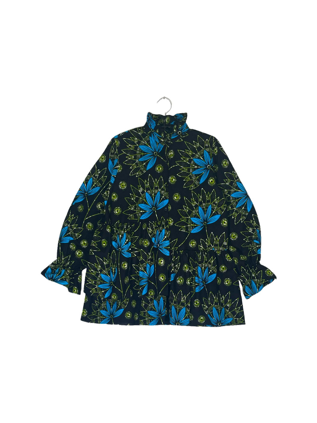 An elegant top with a ruffled stand collar and poet sleeves. The asymmetrical two-tiered hem design adds a playful touch. With the elastic on the wrist, sleeve lengths are adjustable.