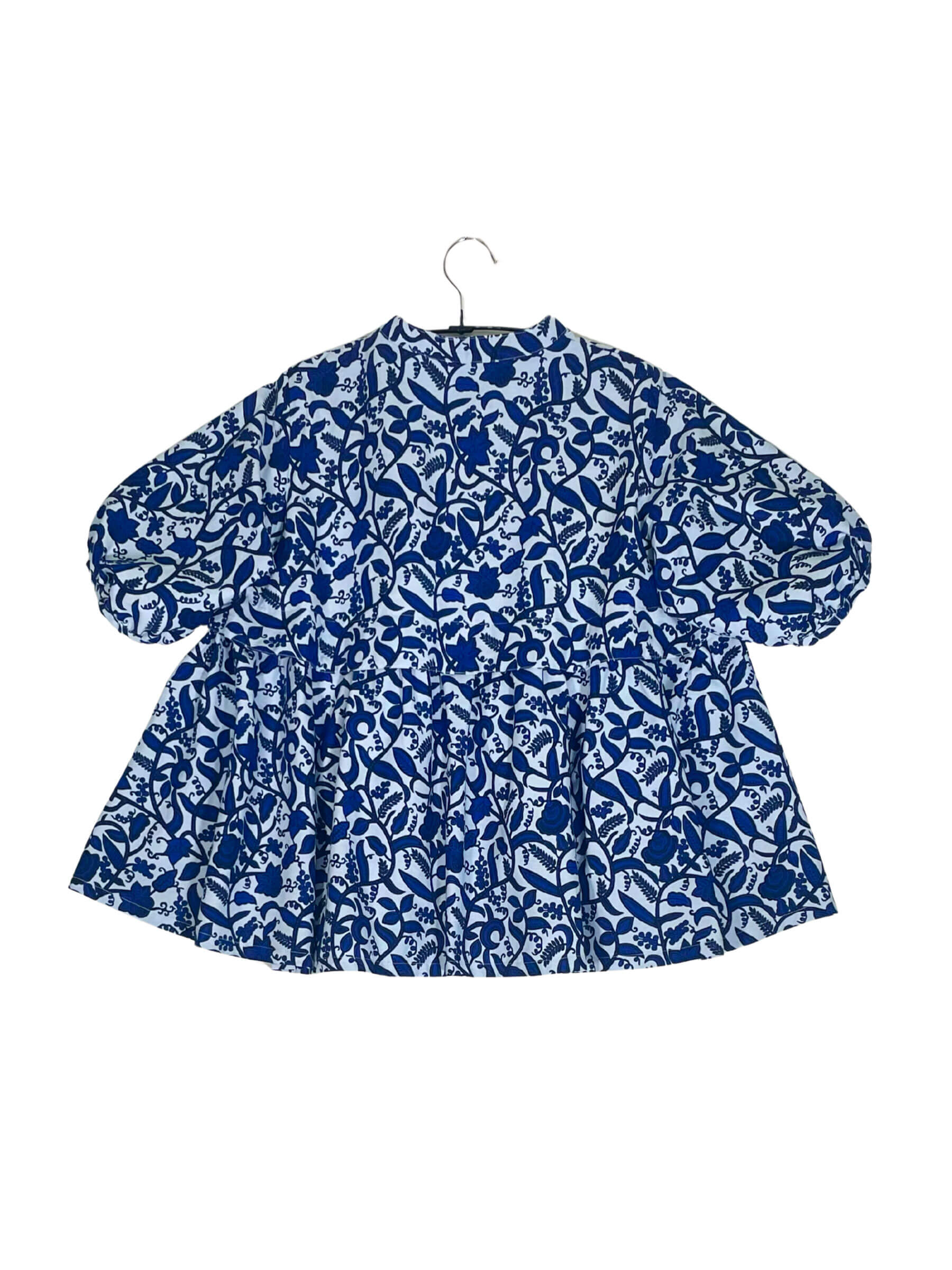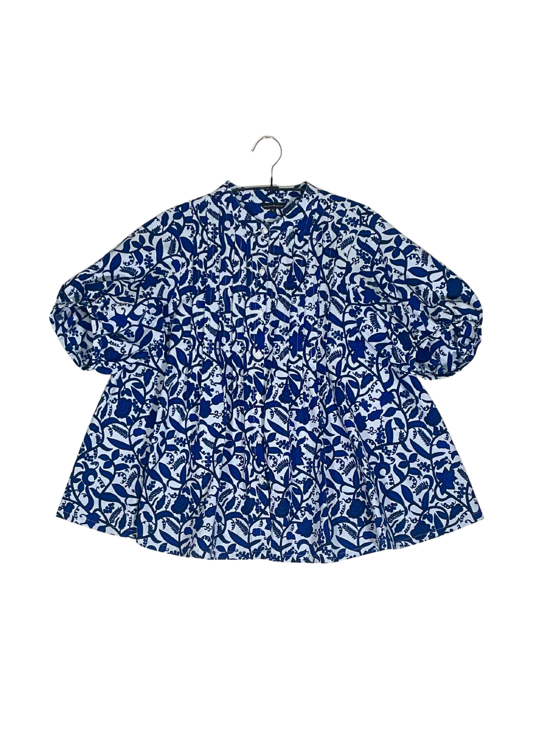 Our very first women's shirt has this fluffy A-line silhouette and voluminous sleeves, it gives a feminine impression. There are 10 pin tucks on the chest. The rounded, seashell-like sleeves are not only cute but also cover your upper arms perfectly. This oversized band collar shirt is easy to balance with your everyday outfits, gives a trendy look with any pants style, and can also be worn as a short cardigan.